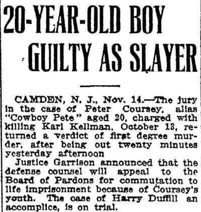 2919 High Street 1890s-1940s Trenton NJ Times Carl Kellman Jr. was murdered on October 13, 1912 in the course of a robbery by Harry Duffiield and Frederick "Cowboy Pete" Coursey, who were tried and convicted. Sentenced to 15 and 30 years in prison respectively, they were paroled in 1920. |