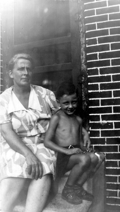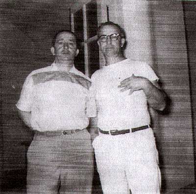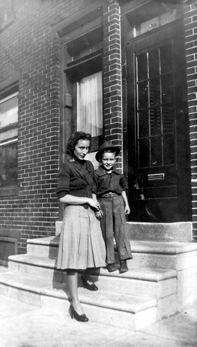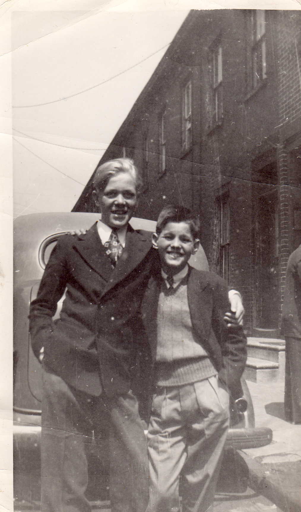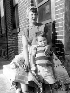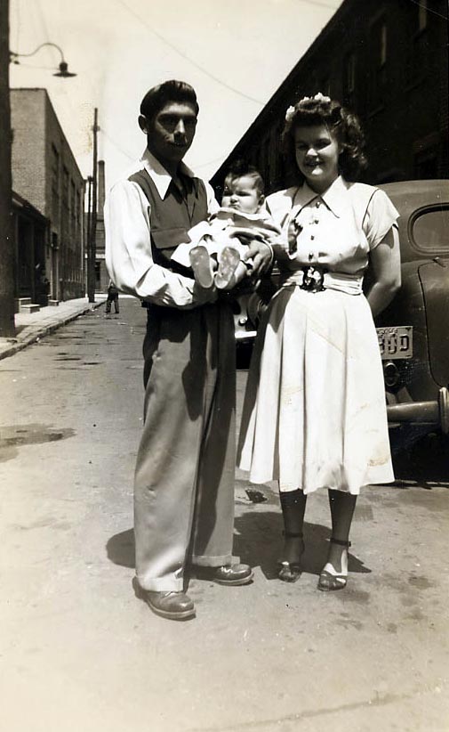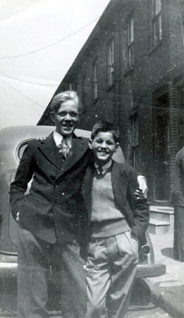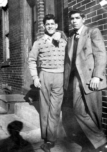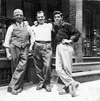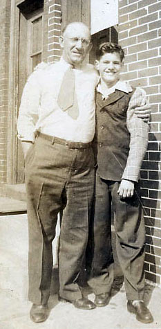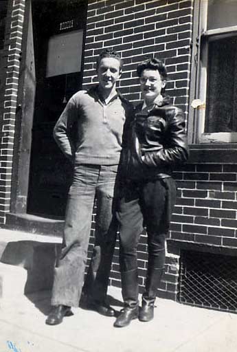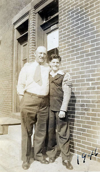 ABOVE: Father and Son, Louis Edwards (left) and Gene Edwards on the 900 Block of Howard Street, photo from the early 1940s. The John R. Evans Company leather factory is visible at the rear of the picture, on Erie Street. The two-story industrial building on left was used as a warehouse by the Mathis Shipbuilding Company in the 1940s. |