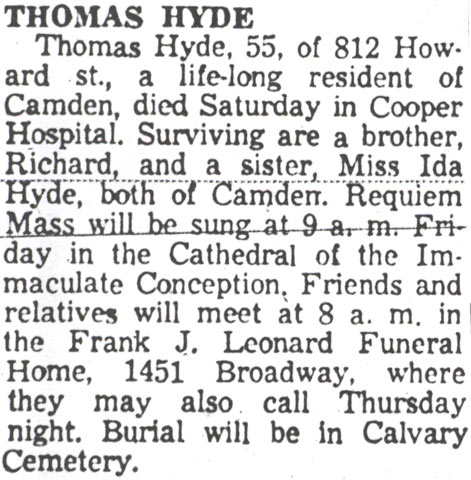 A double funeral will be held tomorrow for a Camden mother and her daughter, killed Sunday when a train struck an automobile in which they were riding at Lansdale. Pa. They were Mrs. Mary A. Hillman, 46, of 810 Howard Street, and her daughter, Miss Eleanor M. Hillman. The funeral will be held at 2 p. m. at 736 Market Street. Burial will be in Harleigh Cemetery. Mrs. Hillman was the widow of Lester C. Hillman. Fred G. Brummer, Jr., 24, of 629 Clinton Street, fiancé of Miss Hillman and driver of the car, was in a critical condition in Montgomery Hospital, Norristown. Mrs. Milton Wenhold, of Lansdale, who was also in the wreck, was also in a serious condition. Both have possible fractured skulls. |