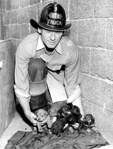 817 Howard Street 1959 A VERY LUCKY LITTER Fireman George P. Baxter of Ladder Company 1, displays the fruits of his labor, a newborn litter of pups, rescued from a working fire on Howard Street in North Camden on September 23, 1959. Fireman Baxter's home was at 817 Howard Street at the time of this fire. Photo by Bob Bartosz Click on Image to Enlarge |