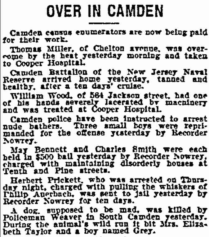 Clarence E. Thomas, a negro, of 905 South Sixteenth Street, Philadelphia, paid $10 fine before the recorder yesterday for driving recklessly. His horse stepped on the foot of Emily Spaide, aged 18 years, of 432 Jackson Street |