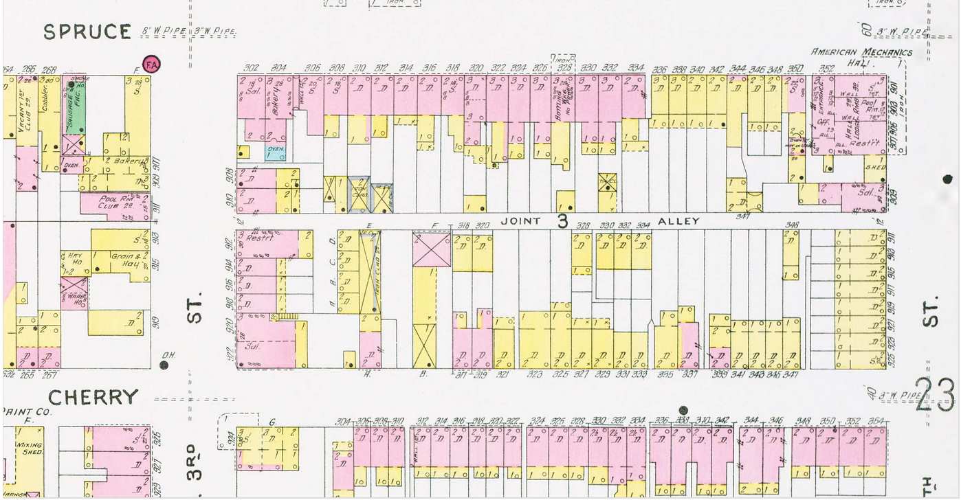 JOINT ALLEY runs for one block, east from South 3rd to South 4th Street, between Spruce and Walnut Streets. The street first appears in city directories in 1850, but there may not have been houses built there until 1888, as none appear in the 1887-1888 City Directory, but several are listed in the 1888-1889 edition. There were only six houses left on Joint Alley by 1947. No buildings have stood on Joint Alley for many years. |