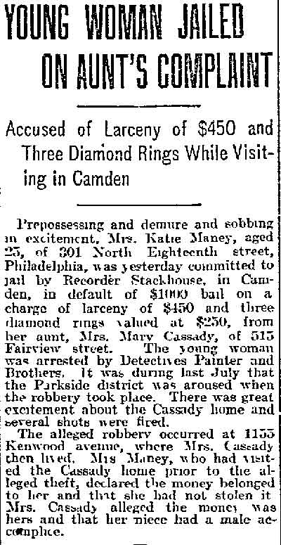 STUDENTS TAKEN IN HOUSE RAID Three Camden women and two Temple University students were arrested in a raid on an al1eged disorderly house at 1450 Kenwood Avenue last night. Charged with being proprietress of the place is Mrs. Charlotte Grimes, 4 8. She is the wife of Elmer Grimes, employed by the city as a custodian at Convention Hall and formerly custodian of the Camden High School athletic field, according to City Prosecutor John H. Reiners, Jr. The students under arrest gave their names as Sidney Goldberg, 19, of 1400 Mt. Ephraim Avenue, and Herman Katz, 19, of 2601 Wilder Street, Philadelphia. Welch Leads Raiders The arrests were made by Police Lieutenant Walter Welch and Detectives Benjamin Simon and Joseph Mardino. According to Welch, Mrs. Grimes signed a statement i n w hich she said she had resided at 1450 Kenwood Avenue for 27 years, and maintained a disorderly house there for the last seven years. He has had men watching the place for a year, to get evidence on which to base a raid, he said. He declared that only persons recommended by patrons were admitted, and then only after making telephone calls. simon , who lives three blocks from the house, and mardino saw a car with Pennsylvania license plates parked near the place last night, Welch said. They waited until they saw Goldberg and Katz leaving the house, and questioned them. It was on the strength of statements by the two youths that the raid was made, Welch added. Cases Continued The five prisoners were taken to police court today. After waiting until 10.05 for simon and mardino to appear, Welch asked that the case be continued until tomorrow. Judge Lewis Liberman set bail for $1000 for Mrs. Grimes; $500 each for the other two women, $200 for Katz and released Goldberg in the custody of his brother, an attorney. The latter said the two youths were willing to plead guilty to disorderly conduct charges, admitting they had been in the place, but Judge liberman said he preferred to wait and hear the entire case to morrow. In answer to the query by the court as to how the two knew about the existence of the disorderly house" Katz said: "Oh, things like that get broadcast around the university." |