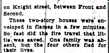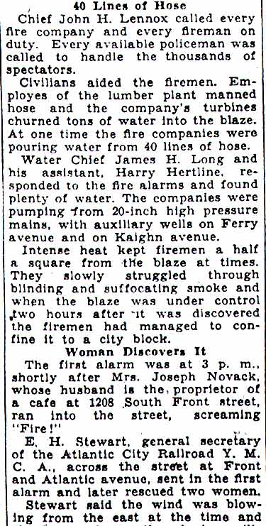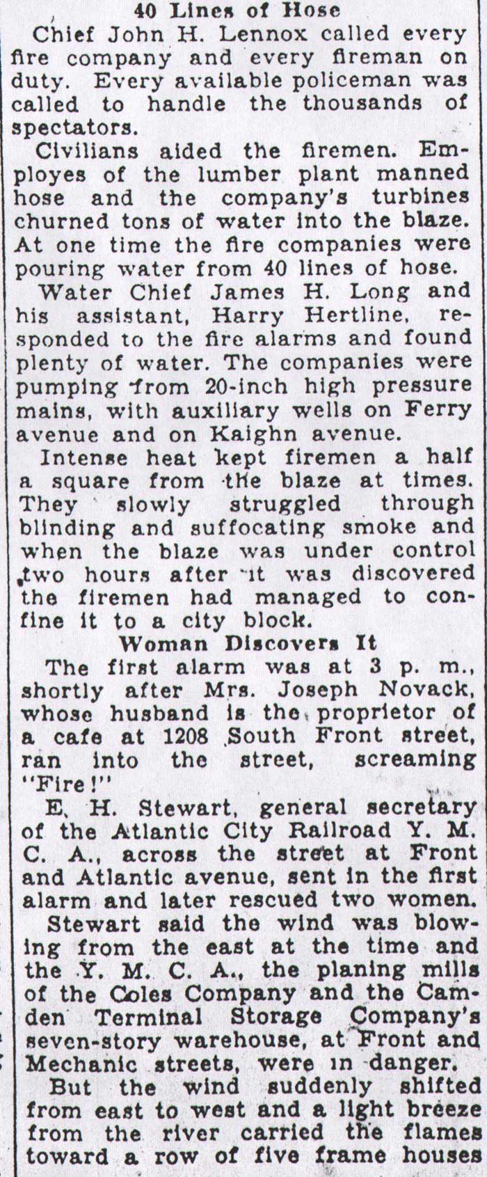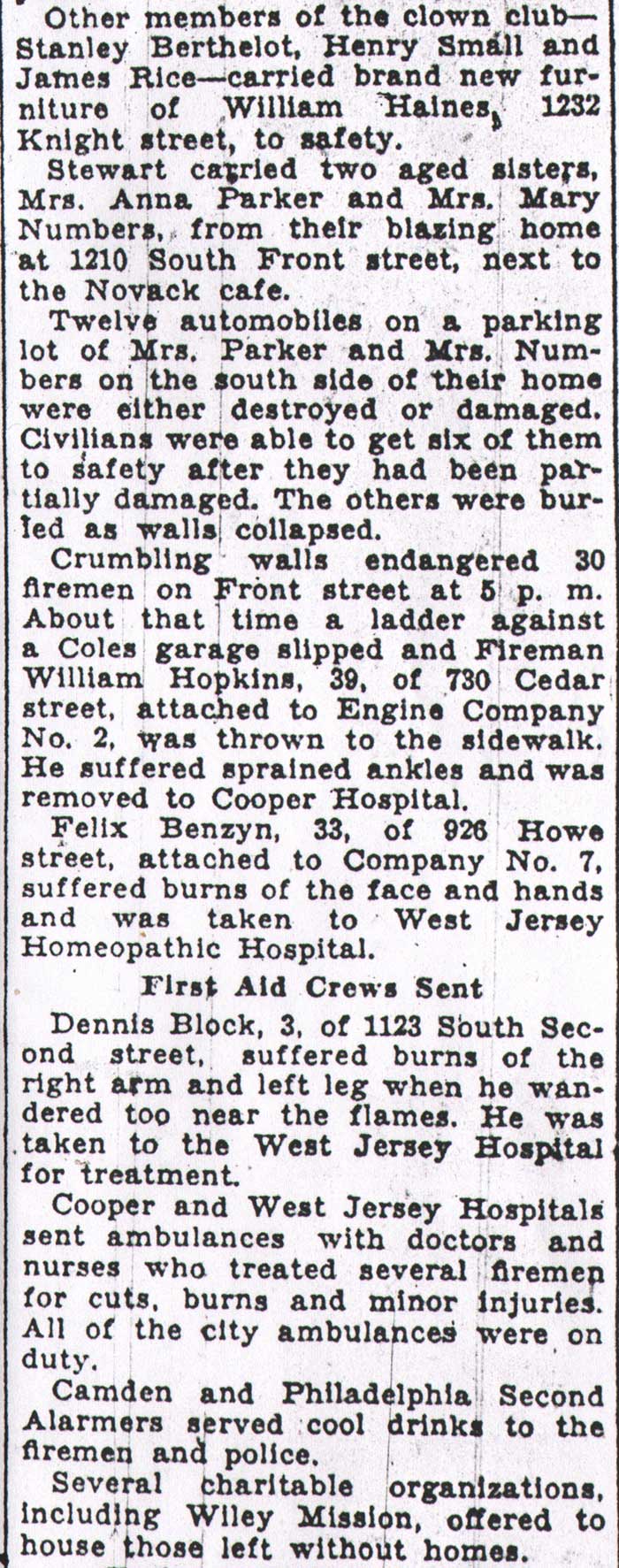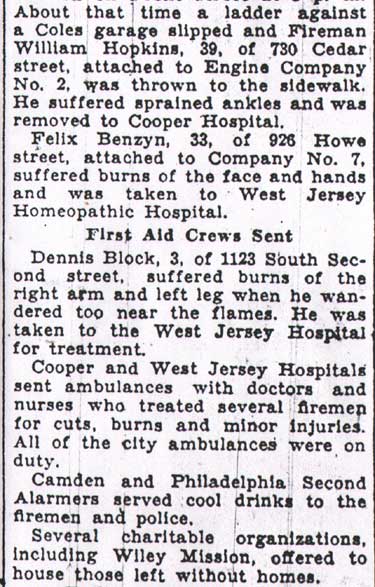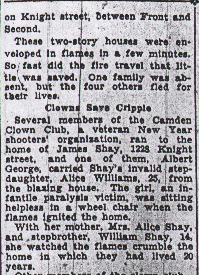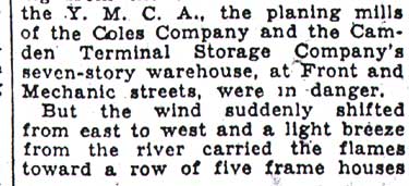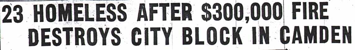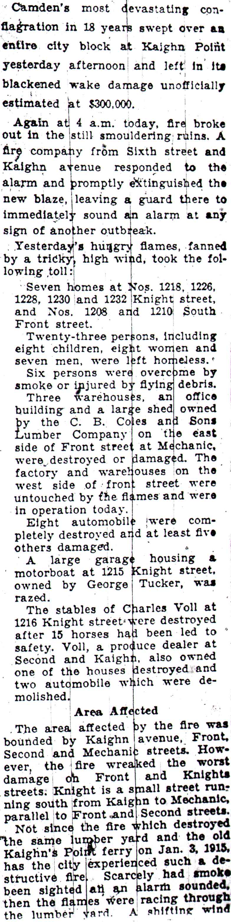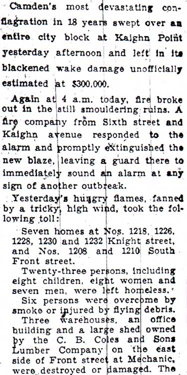 KNIGHT STREET, originally known as Mickle's Alley, first appears in City Directories in 1876. It then ran west of South 2nd Street, from 126 Kaighn Avenue south, ending at Mechanic Street. Mickle;s Alley was renamed Knight Street in 1881. Between 1885 and 1891 the another block was added to Knight Street, running north from Kaighn Avenue to Boyer Street. This new block, the 1100 Block of Knight Street, was renamed Nelson Court sometime after 1891 and before 1906 , then, according to City Directories, renamed Knight Street by 1924, only to be renamed Nelson Street by 1929. Knight Street still had homes on it as late as July 11, 1933 when fire destroyed the five remaining homes and two other buildings along with the C.B. Coles & Sons Company lumberyard, and and two homes on South Front Street. No addresses are listed on Knight in the 1947 Camden City Directory. |