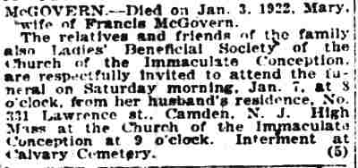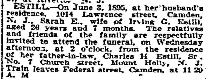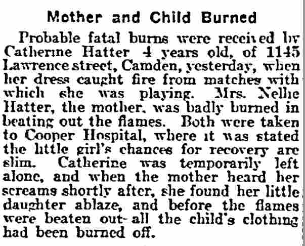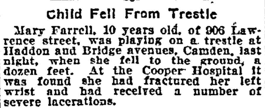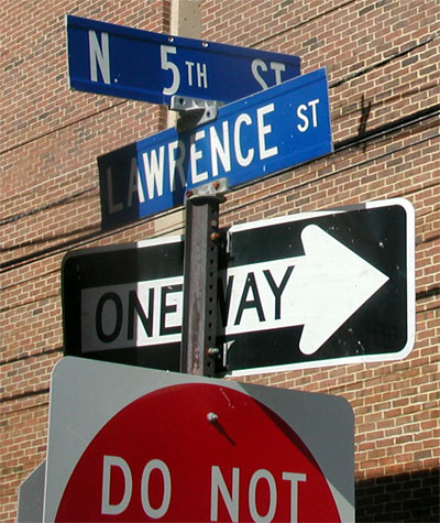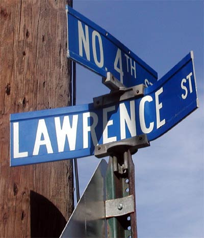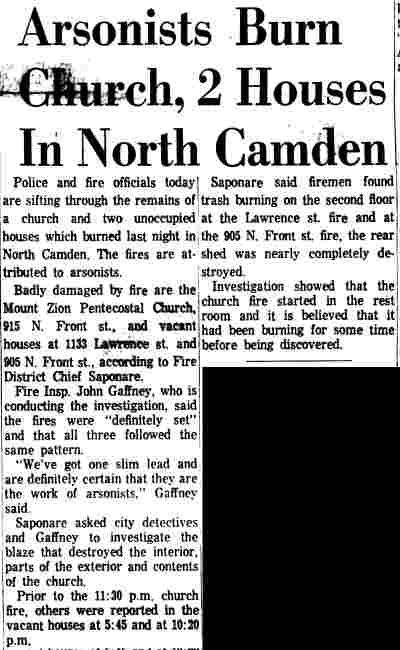 LAWRENCE STREET is an east-west street that lays between Cooper Street and Penn Street. It originally ran from North 3rd Street through to North 11th Street, only interrupted by railroad tracks in the 900 block. At some point between 1906 and 1912 another block was added to Lawrence Street, when Maple Street, which ran at an angle from Lawrence at North 11th Street to 12th Street, was renamed. Expansion of the Ben Franklin Bridge plaza and the construction of Interstate 676 eliminated the 600, 700, 800, 900, 1000 and mush of the 1100 blocks. Two buildings belonging to Mt. Calvary Baptist Church are located on the 1100 Block of Lawrence Street. |