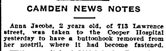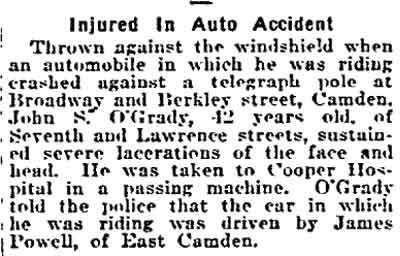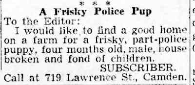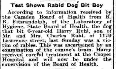 4 BITTEN BY DOGS, ONE FORMER PUGILIST Four persons, including a former Camden boxer, were among victims of dog bites recorded over the weekend. George Delker, 54, of 29 South Forty-second Street, the former boxer was attacked at Pennsville while romping on the beach with a pet spaniel. Delker was treated by a physician for lacerations of the left foot. At Cooper Hospital three persons received treatment. They are Jonas Cooper, 24, of 1163 Lawrence Street; bit on left arm; Lawrence Repetto, 2, of 117 Main Street, bit on leg, and a physician John Garrity, 17, of 205 Byron Street, bit on leg. |