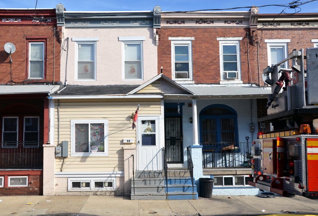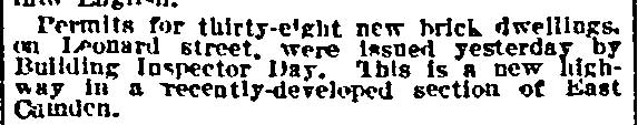 Leonard Avenue runs for one block, from Federal Street north to Westfield Avenue, between north 27th and North 28th Streets, in East Camden. The street and houses are on land that once had been part of St. Patrick's Cemetery. Permits were issued for 38 brick dwellings to be built on the new street on March 19, 1915. |