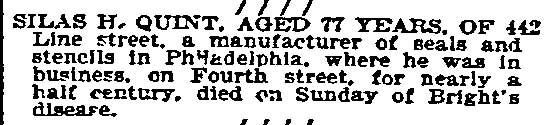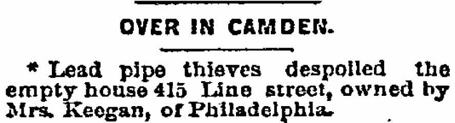 LINE STREET was named because it followed the finally settled line of division between the Cooper and Kaighn properties. It was originally laid out as a twenty foot alley, but in 1848 was made a street fifty foot wide. In 1848, when the city charter was amended by the State legislature, Line Street became the boundary between the Middle and South wards, Arch and Federal Streets serving as the boundary between the Middle and North Wards. Line Street is not to be confused with Liney Ditch, also known as Little Newton Creek and Kaighn’s Run, which served as the southern boundary of the South Ward. In time, under the encroachments of settlers and the march of industrial progress, the stream began to fill up and became merely a ditch, to which, by common consent, the name Line Ditch was given, as it also served to divide the lands of the Kaighn and Mickle families. |