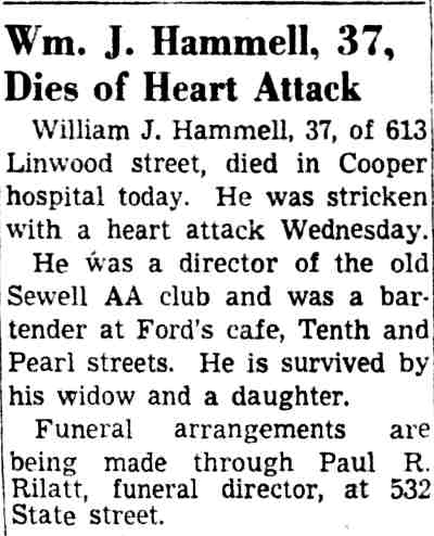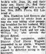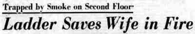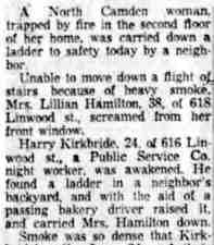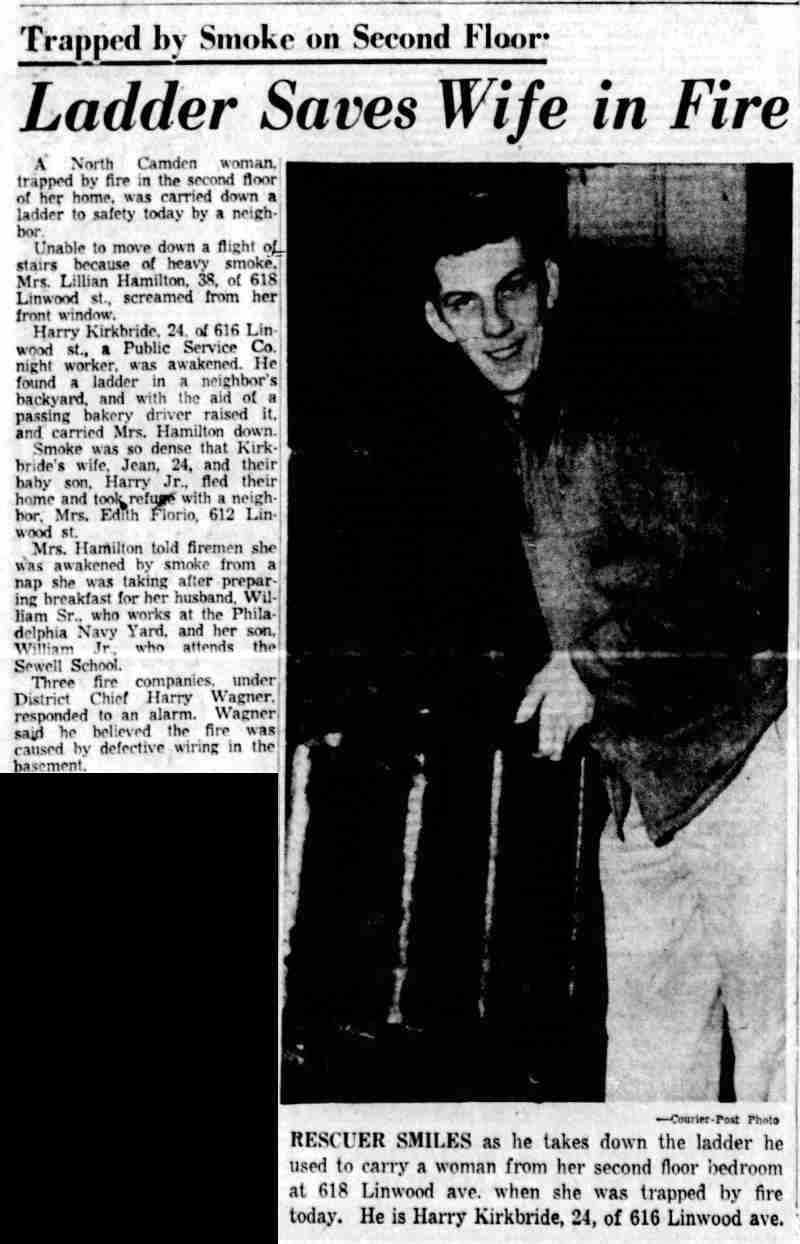 1956 Camden Courier-Post Rescuer smiles as he takes down the ladder he used to carry a woman from her second-floor bedroom at 618 LInwood Avenue when she was trapped by a fire today. He is Harry Kirkbride, 24, of 616 Linwood Avenue. |