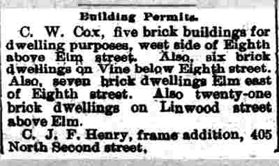 LINWOOD STREET runs for one block, north from Elm Street to Vine Street, between Willard Street and North 9th Street. The street first appears in city directories in 1890. Homes were built on Linwood Street in 1891 by Charles W. Cox and quickly occupied, with residents first being listed in 1892. The only house still standing on Linwood Street in 2008 is 650 Linwood. |