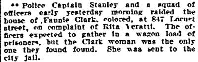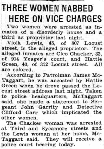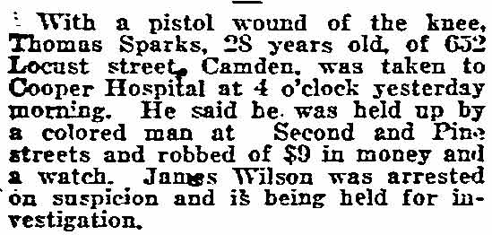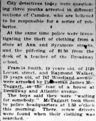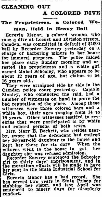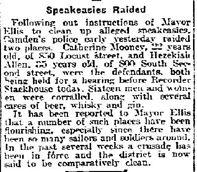 $1005 IN WEEKEND RAIDS A weekend of raiding in which 59 men and women were arrested in two disorderly houses, and a restaurant dispensing beer enriched the coffers of the Camden city treasury yesterday by $1005. Proprietors of the three establishments were fined $100 each by Judge Garfield Pancoast on charges of violating the city disorderly act. An inmate of one of the disorderly houses was sentenced to three months in jail, having ignored a warning to leave town. The raid on the Blue Hour Luncheonette, 1282 Liberty Street, early Sunday in which 43 were arrested is said to have been the largest of its type in the city in more than a year. The disorderly houses raided were located at 818 and 1219 Locust Street. Two colored women and six white men were arrested in the first establishment and three men and five women in the second. Pearl Williams, an inmate of the establishment at 818 Locust street, was sentenced to three months in jail, while Mary Young, proprietress, and Leona West, proprietress of the second establishment, were each fined $100. All of the men arrested were either fined $25 or forfeited securities of $25 each. The establishment at 1219 Locust Street, raided late Sunday night by Sergeant Frank Truax and detectives is said to be the most luxurious of its kind found in this city. |