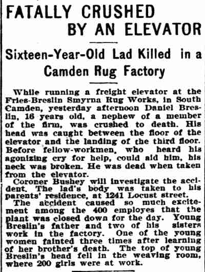 1899-1910 Camden Post-Telegram Fries-Breslin Smyrna Rug Works Ellen Breslin married Michel Barry in 1902. 1910 Census shows Michael & Ellen Barry, children Daniel (6), Helen (4), and mother Sarah Breslin at 1241 Locust Street. The family moved to Harrisburg, Pennsylvania in the 1910s.