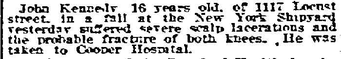 Five persons were injured Saturday morning when a truck, and passenger automobile collided at Eighth and Van Hook Streets. The truck, containing four workmen, was overturned. Dominic Fanelle, 20, of 703 Locust Street, driver of the truck, suffered chest and back injuries. The injured were taken to the West Jersey Homeopathic Hospital. The driver of the car, Mrs. Anna K. Holt, 30, of 2898 North Congress Road, was cut and bruised. The others injured were Fioranto Costanzo, 18, of 209 Beckett Street; Felix Lee, 50, Cuthbert Road, Haddon Township, and Love Troutman, 56, of 717 South Eighth Street. All were cut and bruised. |