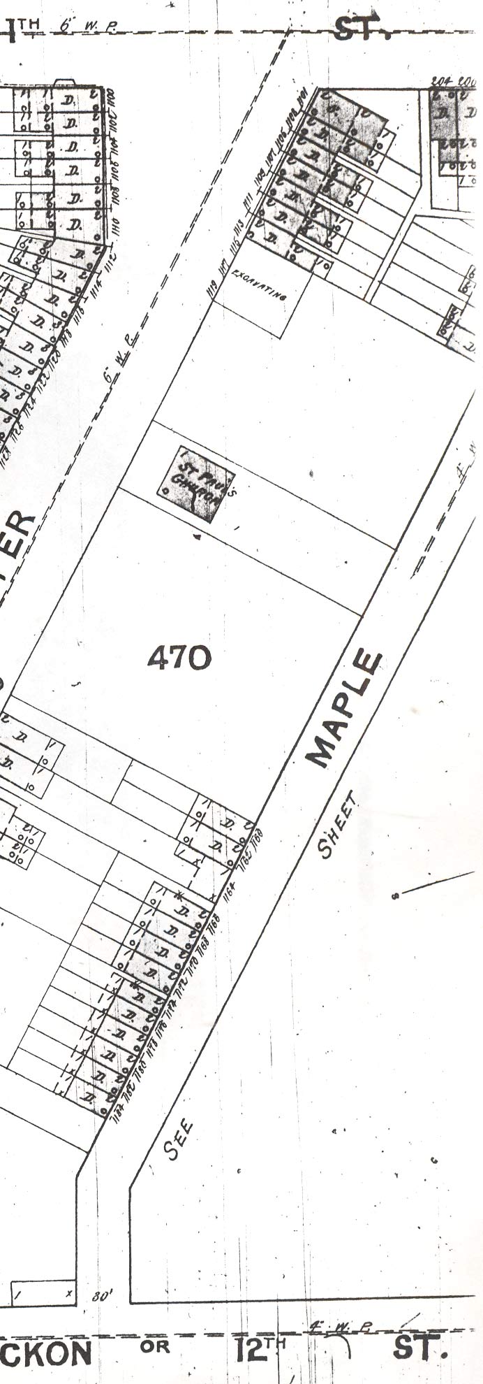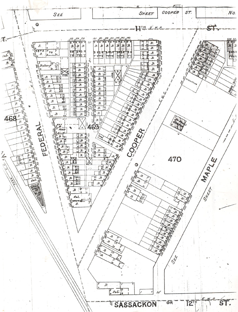 MAPLE STREET ran southeast from North 11th Street for one block, to North 12th Street (which was originally known as Sassackon Street. Maple Street ran parallel to Cooper Street, and for consistency's sake and to eliminate confusion, was renamed Lawrence Street some time between 1906 and 1912. One or two structures remain on the re-named street, which is most noted today as the street that runs behind Mount Calvary Baptist Church, whose address is 1196 Penn Street. |