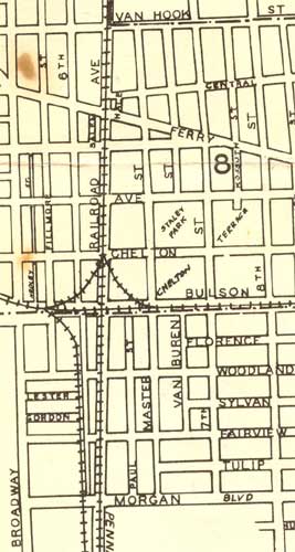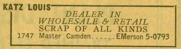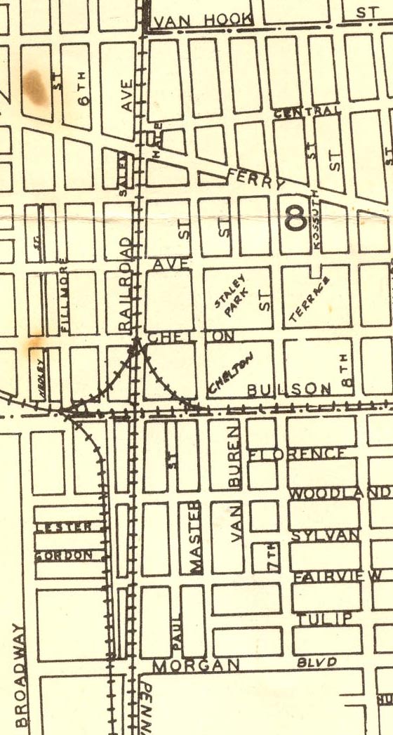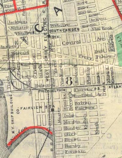 MASTER STREET was originally called Taylor street and first appeared in Camden City Directories in 1878. By 1887 the street had been rechristened with its current name. Master Street runs between South 6th Street, I-676, and South 7th Streets from 648 Van Hook Street south, crossing Central Avenue, Ferry Avenue, Viola Street, Jefferson Avenue, and Chelton Avenue, to the railroad tracks along Bulson Street, in Camden's Centerville neighborhood. The street lay in what was for many years Camden's Eighth Ward. When first laid out, Master Street was to have continued south across Morgan Boulevard to Newton Creek, as shown below in a map published in 1914. Master Street did, in fact, get continued to Morgan Boulevard, however. there were no structures with addresses south of Bulson Street in 1947. There were many families at one time of Eastern European descent, a great percentage being Ukrainian Catholics and Catholics from Slovenia and Croatia, and also many Black families, especially around Chelton Avenue. An all-black public housing project, Chelton Terrace, was built in the 2100 block in 1943, a second, Roosevelt Manor, was built in the following decade along South Seventh Street between Van Hook Street and Ferry Avenue. Just about every building with an address on Master Street between Van Hook Street and Chelton Avenue were razed over the ensuing years. Much of the old Eighth Ward was declared "blighted" and razed after World War II. Many buildings in the neighborhood were leveled when the interstate highway, I-676, was built. |
