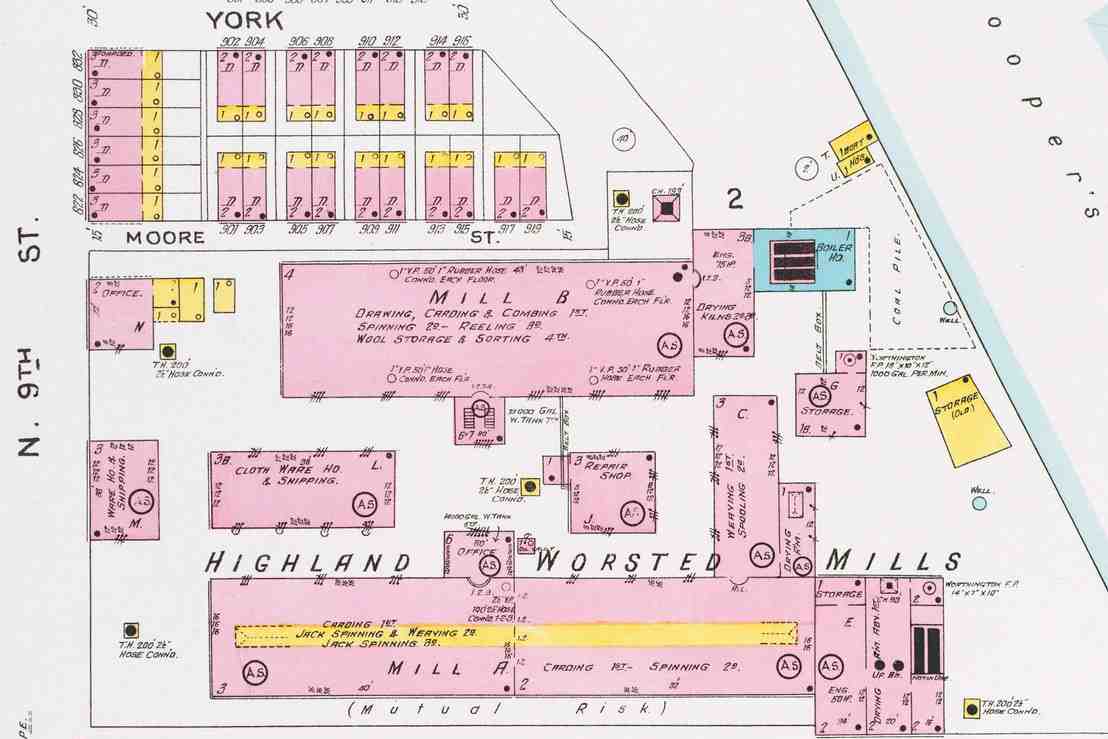 Moore STREET was a small street that ran eastwardly from North 9th Street towards the Cooper River south of York Street. The street appears in Camden City Directories as early as 1867. Five two-story twin homes were built on the north side of Moore Street prior to 1906. The south side of Moore Street was entirely taken up by the Highland Worsted Mill. Mike Larson wrote in May of 2020: " In the 1960's the houses were all leveled. You could see a small Cobblestone street and the foundations of small houses. One more thing about Moore Street. Most streets in North Camden were level, not Moore street. It dramatically sloped toward the Cooper river. If a baby carriage got away from you there would have a been a tragedy." |