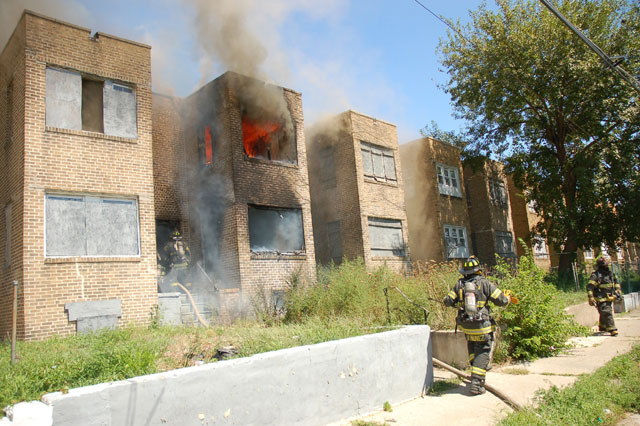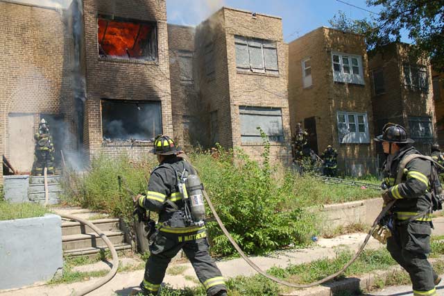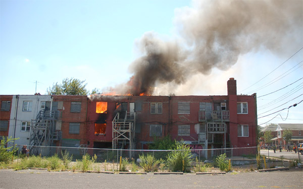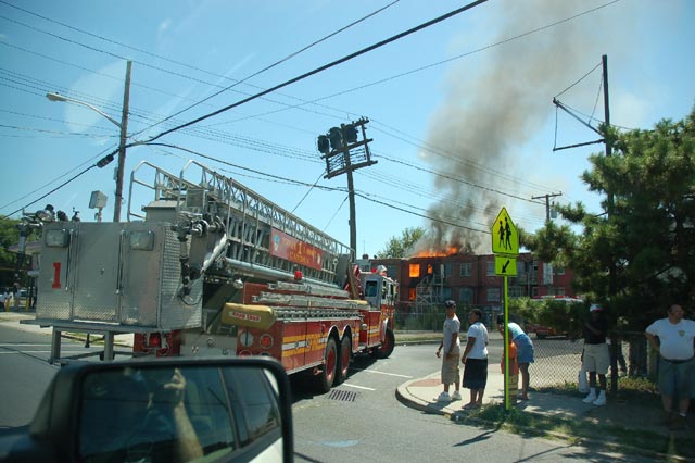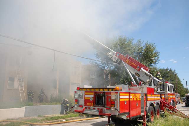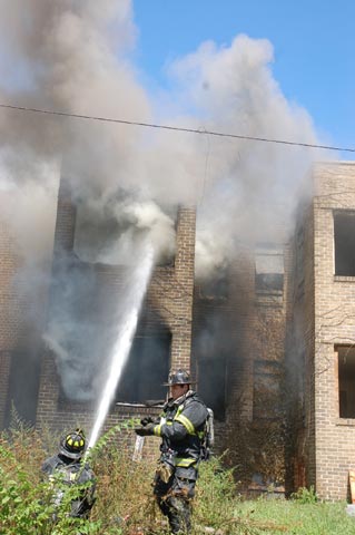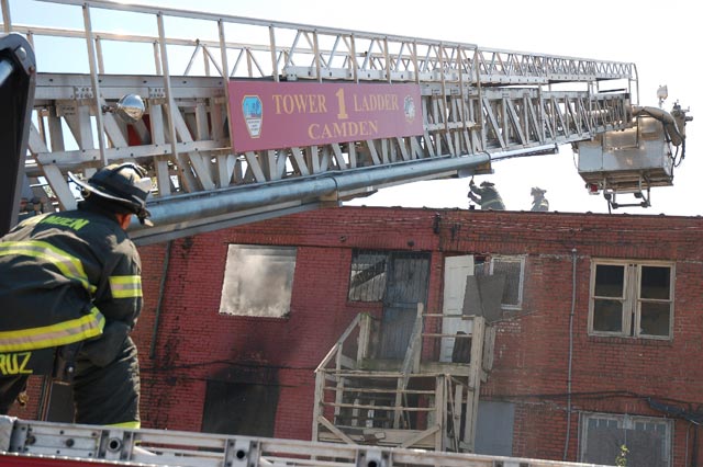 Shortly after 1:30 p.m. on August 22, 2008, Camden, New Jersey Firefighters were dispatched to the 200 Block of Morse Street, in the East Camden section of the City for a reported dwelling fire. Fire Radio was receiving numerous calls for an heavy involved dwelling. And additional Engine Co. and Battalion Chief was added to the assignment. The first in Units reported that they had a heavy involved dwelling in the middle of the row of vacant and some occupied dwellings. All Companies were going into Service with their heaviest water lines and a 2nd Alarm was quickly sounded and due to the first and second floors being unstable an exterior attack was being made. Companies were able to open up the adjoining exposures and were able to stop the spread of the fire to the rest of the row of dwellings. Ladder Co. 1 and Co. 3 went into Service with Ladder Pipes as fire fighters used numerous 2 1/2 and 1 3/4 inch water lines to knock the fire down. The fire was placed Under Control in 30 minutes as fire fighters remained on the scene overhauling and assisting the Fire Marshal with the investigation. Click Here For More Picture From This Fire |