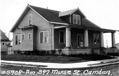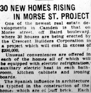 Morse Street Camden Courier-Post October 8, 1947 DUPLEX HOME, offered to veterans by Baird Boulevard Homes, Inc., Twenty- seventh Street and Marlton Pike, is shown above. The sample home, at 412 Morse Street, is open for inspection. Twenty of the first 23 available for sale, have been sold, the company reports. |