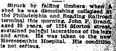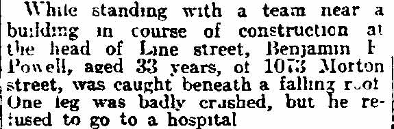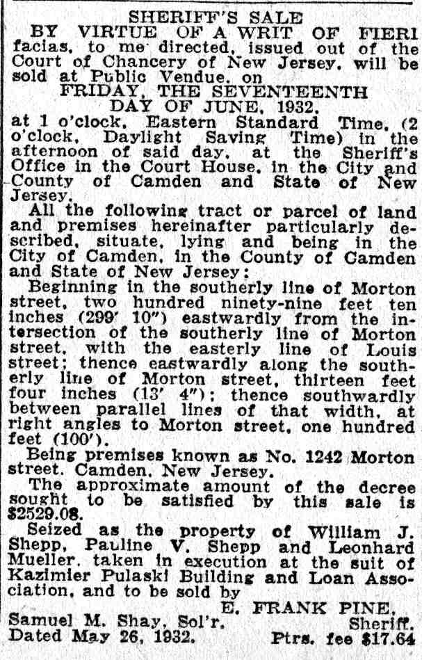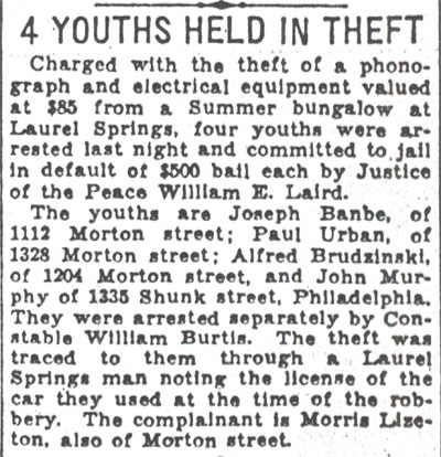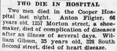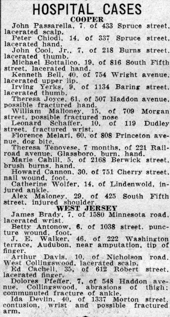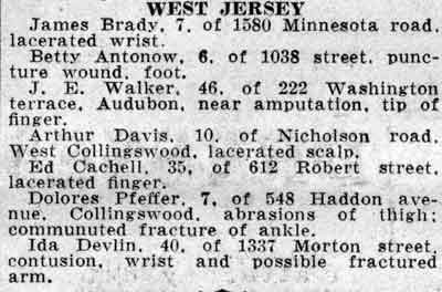 TELLS OF LEAP TO ESCAPE CAPTOR After little 10-year-old Mamie Zimmie, 1181 Morton Street, finished telling a story of how she had been lured into a house, and had escaped by leaping to the ground from a porch roof. Police Judge Bernard Bertman this morning held Samuel Osler, 18 years old, 1450 Mount Ephraim Avenue in $2500 bail for the Grand Jury. In default young Osler was committed to the county jail. Facing a courtroom, crowded with spectators, and showing no sign of fear or excitement, Mamie, while on the witness stand, turned toward the youth, six years her senior, and declared, "That’s the boy who tried to hurt me.” Detective Frank Truax testified that he arrested Osler yesterday afternoon in his home at the Mt. Ephraim Avenue address, after the Zimmie girl had accused him. On the stand and the object of the stare of those who packed the courtroom, Mamie dramatically recited the events of yesterday afternoon which led to her leap from the porch roof and her removal to the West Jersey Hospital, cut, bruised and lame. The girl's leap had been witnessed by Frank Clark, of 1006 South Ninth Street who picked her up and took her to the hospital. She was treated for cuts and bruises and allowed to go home. Her father, William Zimmie, testified that his daughter had complained of pains in her back, all night. On the stand in his own defense, Osler said that Mamie had followed him into the house and up the stairs. “When I went into the bathroom to get some money, she jumped out of the window, I did not know her,” he declared . |