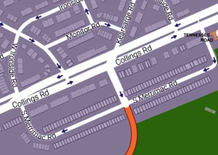 NEW MERRIMAC ROAD, also known as South Merrimac Road, runs south and then east, beginning at North Collings Road, opposite West Ironsides Road, and ending at Tennessee Road. |