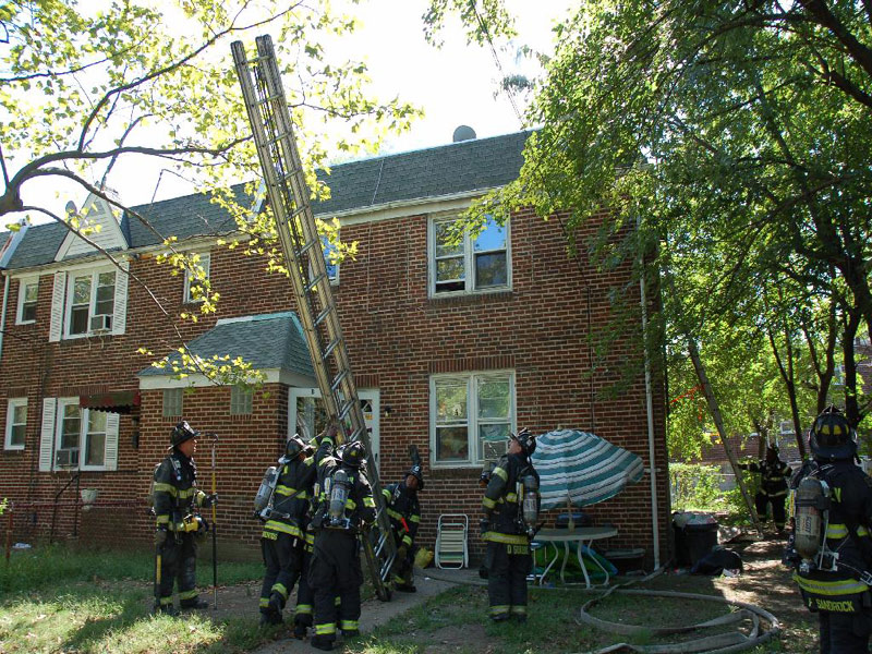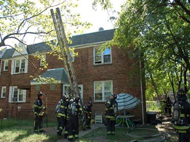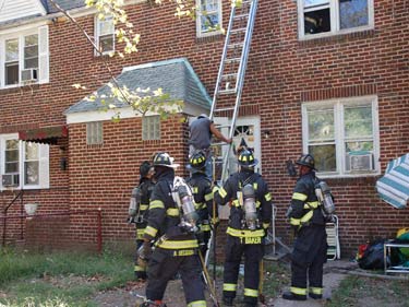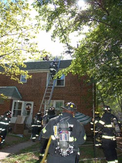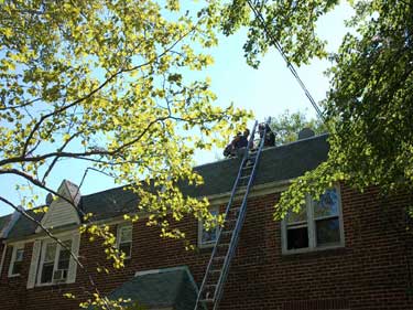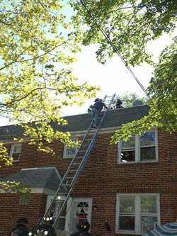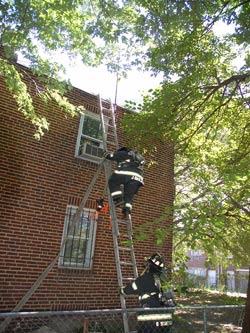 Photos 2 & 3: Fire Fighters from Ladder 3 putting up ladder to rescue man on roof |