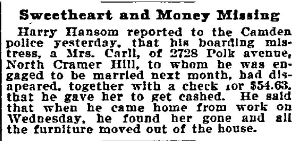1897-1899 Philadelphia inquirer This story appears mangled. Harry Hansom did board in the neighborhood in the 1890s, but there never was a house at 2728 POLK Avenue. Andrew Carroll did live at 2738 in 1898. He moved in 1899, and passed away in 1903, still married to his wife Kate.. |