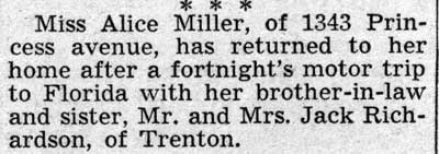 Miss Alice E. Miller, of 1345 Princess avenue, is motoring to Miami, Fla., for a two weeks' stay. |