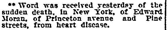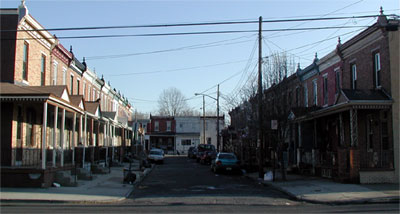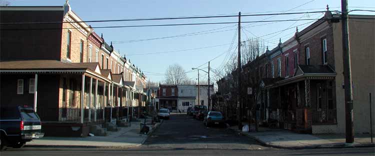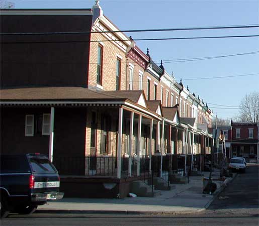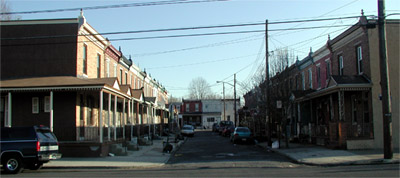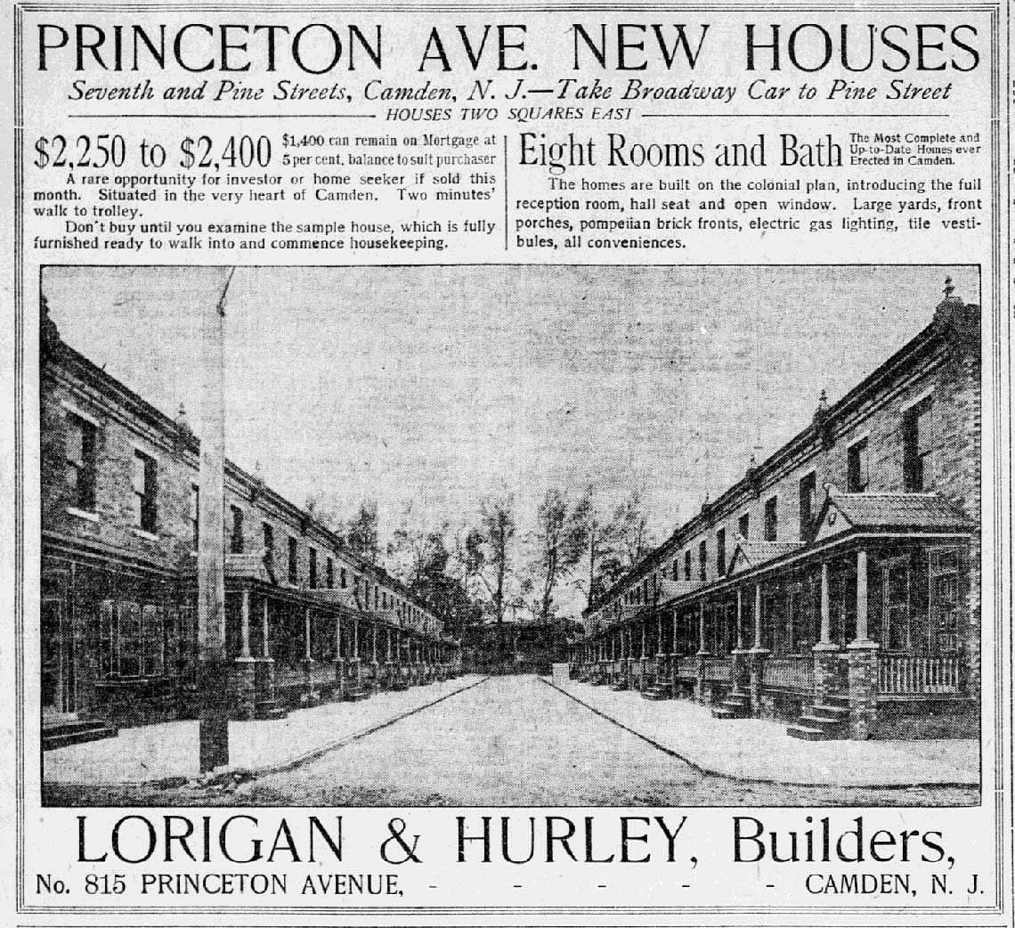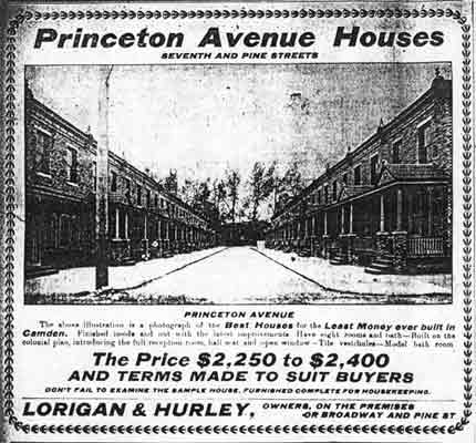 PRINCETON AVENUE, "The best houses for the least amount of money ever built in Camden" according to a 1902 advertisement, runs for one block, parallel east of South 7th Street between pine and Division Streets. Built by the Lorigan & Hurley, a partnership consisting of builder William J. Lorigan and department store magnate William Leonard Hurley, the homes featured eight rooms and a bath, tiled vestibule, and an elevated and roofed front porch. |