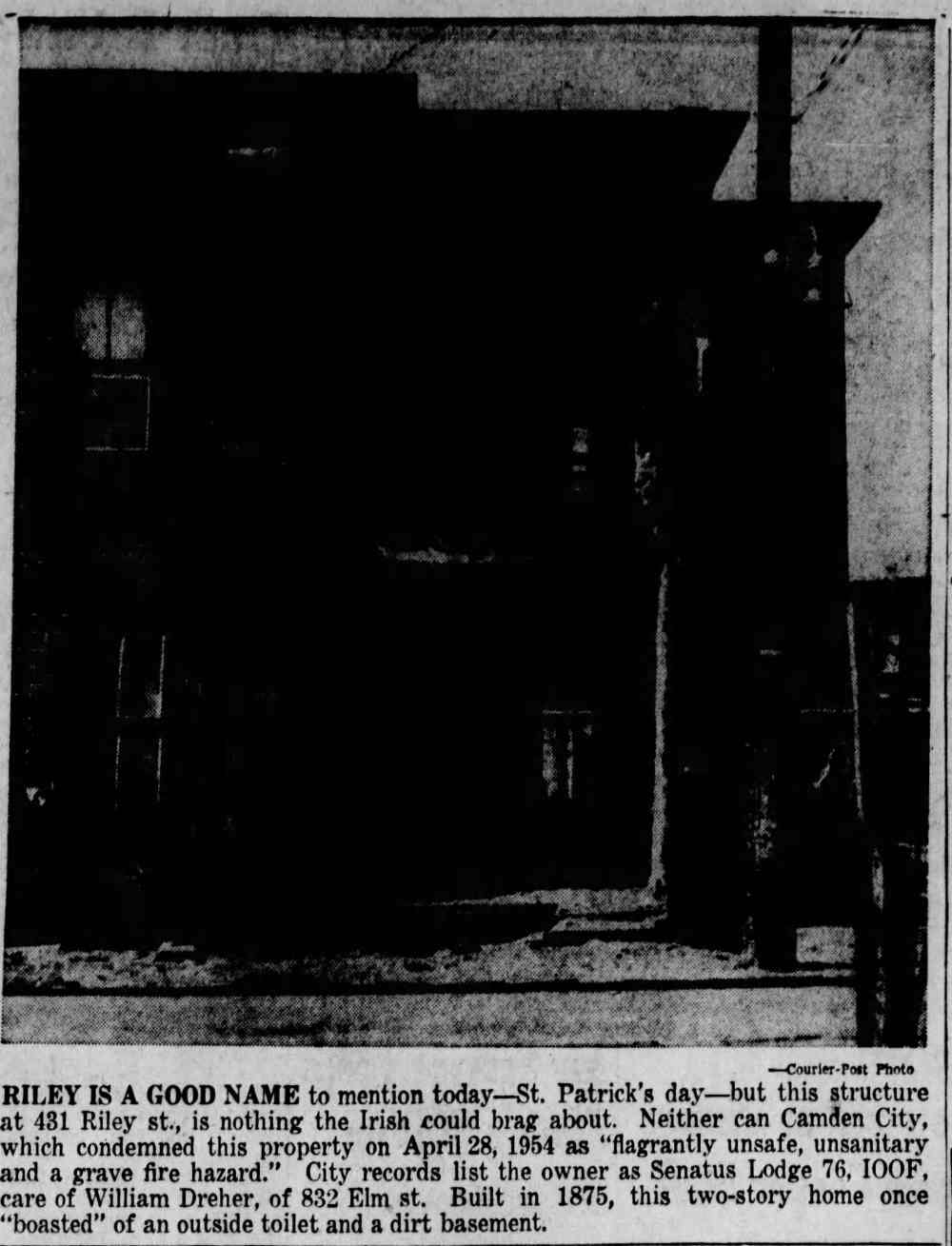 Senatus Lodge 76, IOOF Camden Courier-Post RILEY IS A GOOD NAME to mention today - St. Patrick's day - but this structure at 431 Riley Street is nothing the Irish could brag about. Neither can Camden City, which condemned this property on April 28, 1954 as "flagrantly unsafe, unsanitary and a grave fire hazard." City records list the owner as Senatus Lodge 76, IOOF care of William Dreher, of 832 Elm Street. Built in 1875, this two-story home once "boasted" of an outside toilet and a dirt basement |
