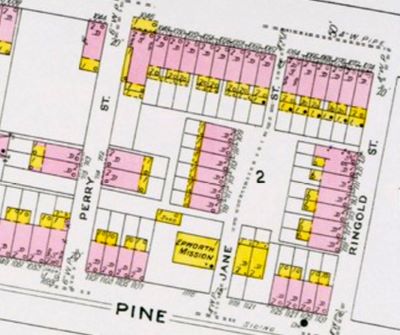 RINGGOLD STREET was a small street that ran from 1074 Line Street south for one block to 1131 Pine Street. It was the third street east of Haddon Avenue between line and Pine Streets, coming after Perry Street and jane street. Ringgold Street first appear in the 1888-1889 Camden City Directory, the only listing being that of Patrick McBride, who lived and was operating a saloon at 707 Ringgold. By 1890 houses also stood at 711 and 713 Ringgold Street, and in time the lots at 709, 715, 717 and 719 were built on. Camden City Directories show that there were still homes on Ringgold Street as late as 1947. By the 1960s Ringgold Street and all of Line Street east of St. Mihiel Street, including Perry Street and Jane Street had been razed and paved over to provide parking for Campbell Soup's corporate headquarters. |