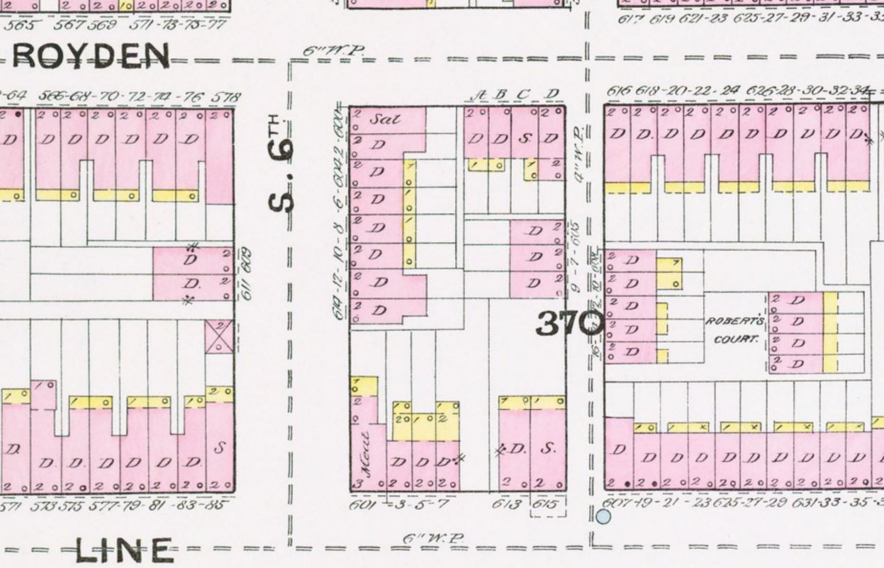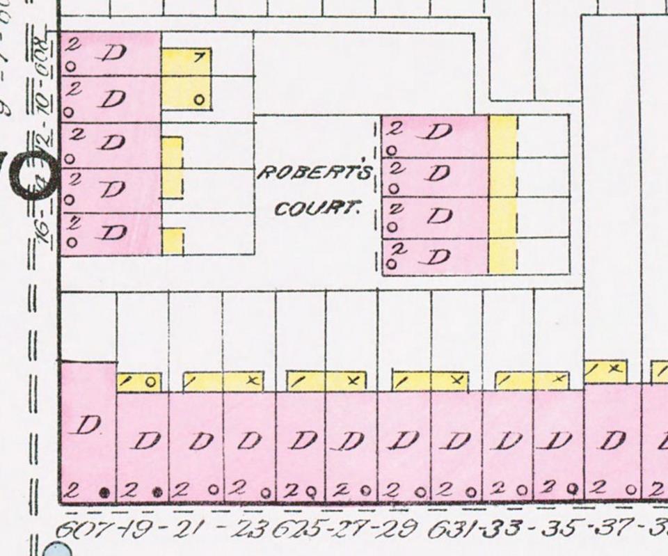ROBERTS COURT was the location of a block of four homes, accessed through an alley that ran eastward from 616 Roberts Street and the rear border of 601 Line Street. It was named by and for Joseph E. Roberts, a successful builder and real estate developer, who was responsible for creating the street and building houses on and near it.