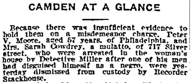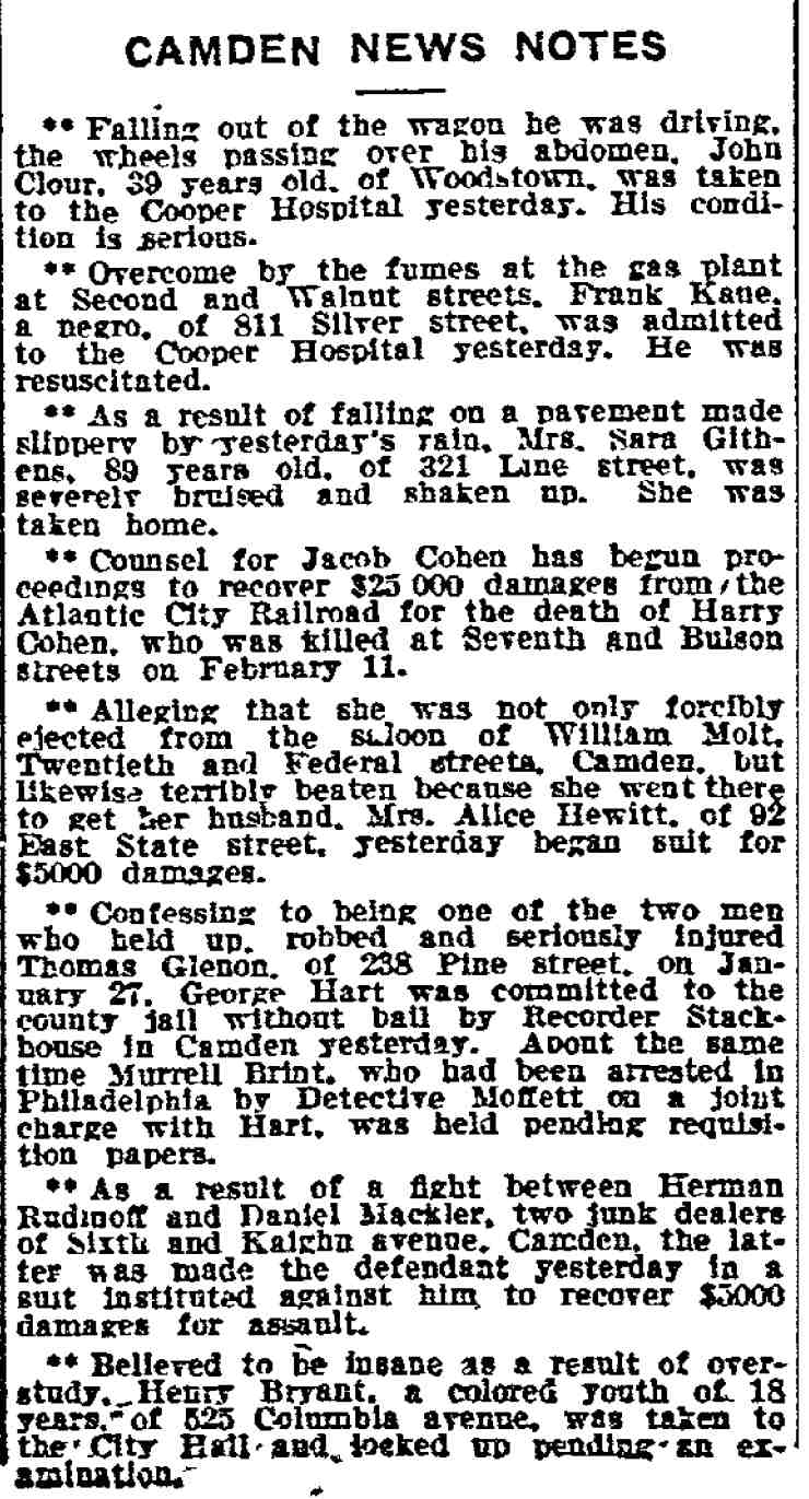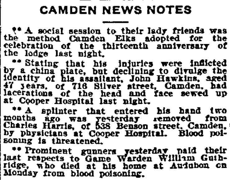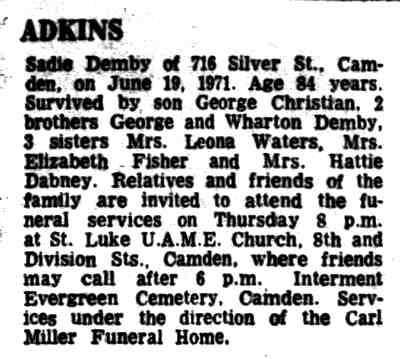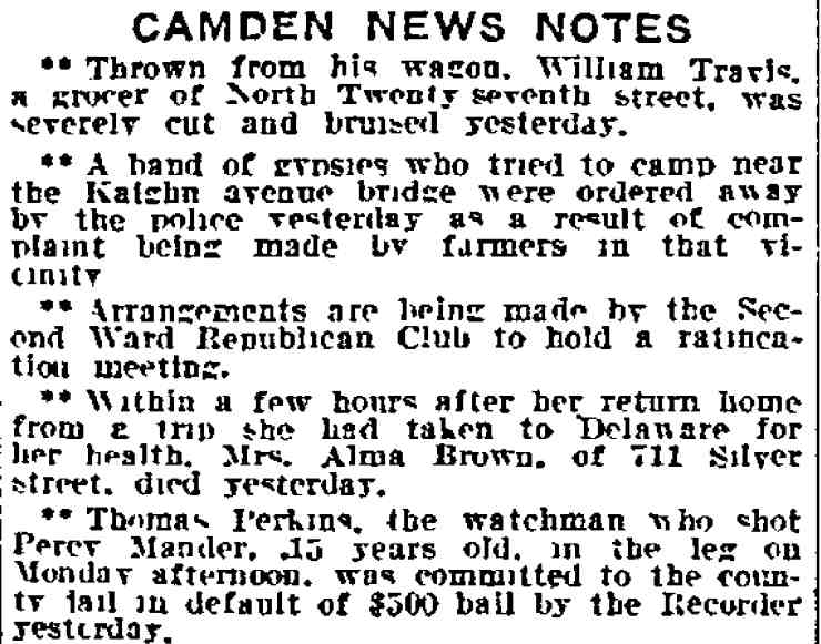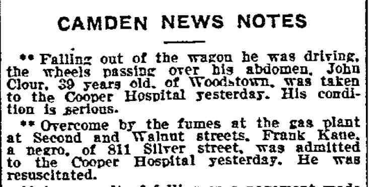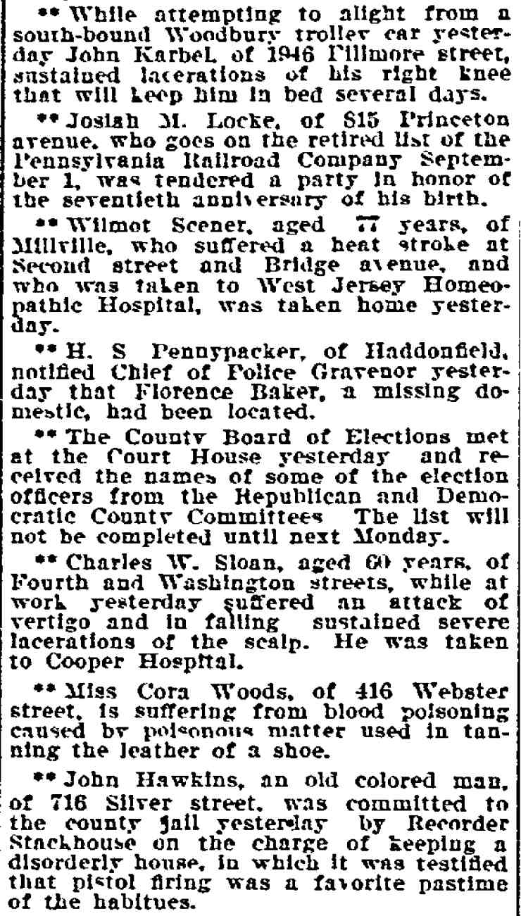 1900-1904 James Clark died on 28 Aug 1910 at 923 Walnut Street, Camden, New Jersey. He was buried in Aug 1910 at 329 White Horse Pike, Lawnside, Camden, New Jersey. |