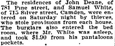SILVER STREET is a two block street that runs north to south from Line Street to Division Street, west of South 8th Street. In the rear of the homes in the 700 block, that is from Line to Pine Street, is a short street with six homes named Gold Street, that is only accessible through an unnamed alley north of 708 Silver Street. By 2009 all of the homes on both Silver Street and Gold Street had been razed. Silver Street still exists in the sense that on can drive through it. Outside of the curb cutouts, all traces of Gold Street are now gone. Silver Street does not appear in the 1885 Sanborn Maps of Camden. Houses in both the 700 and 800 blocks appear in the 1888-1889 Camden City Directory. There were still homes on both blocks as late as 1980. There are no homes listed on gold street in the 1930 Census, however. |