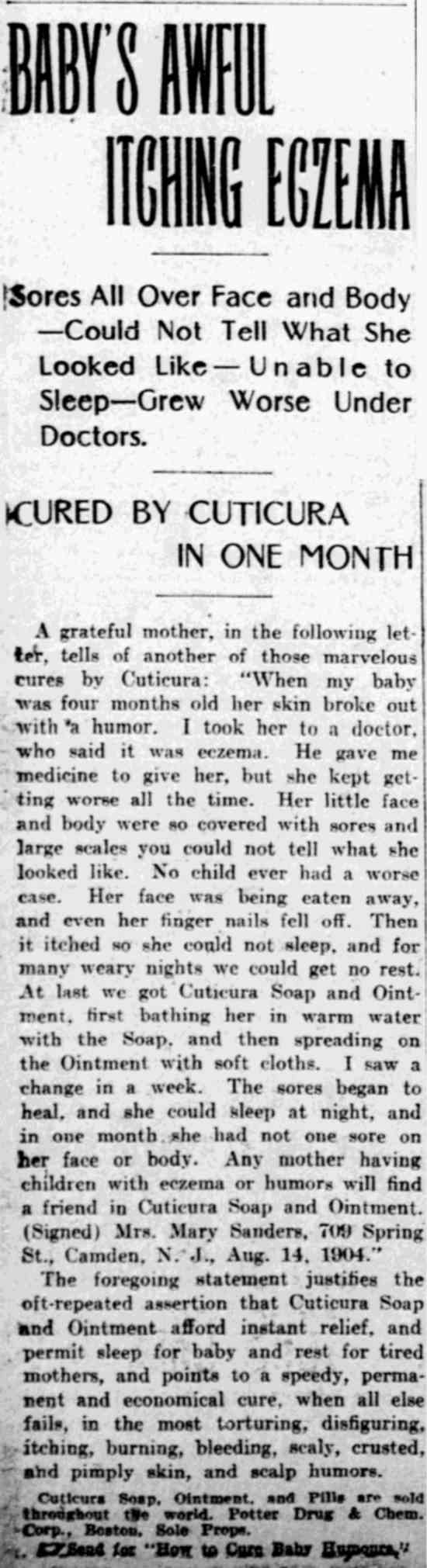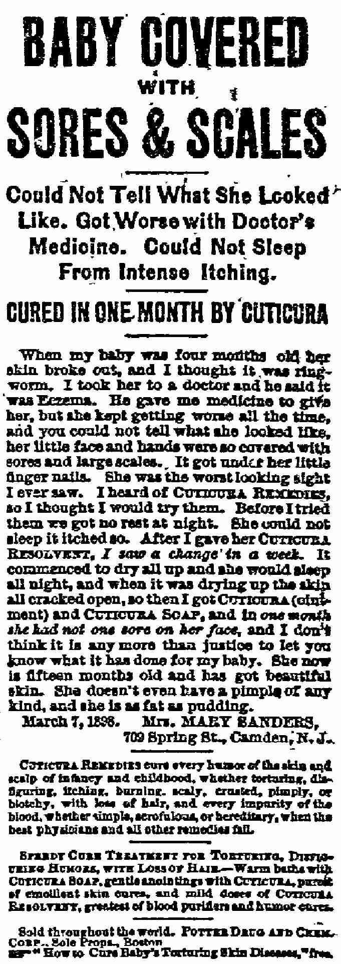 1890-1903 Mary Sanders wrote at least two testimonial letters to the manufacturers of Cuticura, a line of soaps and skin treatment, that were widely used in Cuticura's newspaper advertising campaign. |
