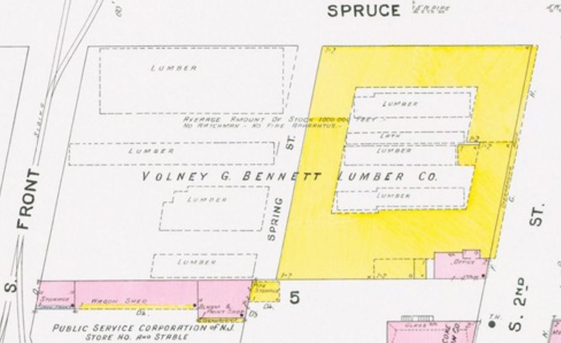 SPRING STREET existed in Camden as early as 1850. By 1891 the street had been mapped out to run north and south from Clinton Street, between of Second Street and Front Street in South Camden. It was intended to go as far south as Walnut Street, but appears to have been interrupted by Volney Bennett's lumber yard at Pine Street. The 1906 Sanborn Map does show a block of Spring Street between Spruce and Cherry Streets within the confines of the lumber yard. Besides the Bennett lumberyard, at least one other industrial building was sited on Spring Street, the S.P. Wright Ink Factory. This complex was located on Spring Street between Clinton and Line Streets. It had closed by 1906, at which time there was talk about converting the plant into a morocco leather factory. Closer to Pine Street, the Henry F. Horsman & Sons teamster business was active in the 1890s. The family lived on Spring Street during these years as well, and after moving away, came back in the mid-1900s. By 1891 a few frame dwellings had been built just north of Pine Street, two of which were still standing as late as 1928. During these years a few families lived on Spring Street for a good number of years, but for the most part City Directories indicate that people came and went after a year or so. An interesting point is that more than a few households occupied two or three addresses at different times. There were a few extended families who spent time on Spring Street as well. By 1947 the residential buildings were long gone, and Spring Street was literally erased after World War II. No physical signs of Spring Street remain. |
