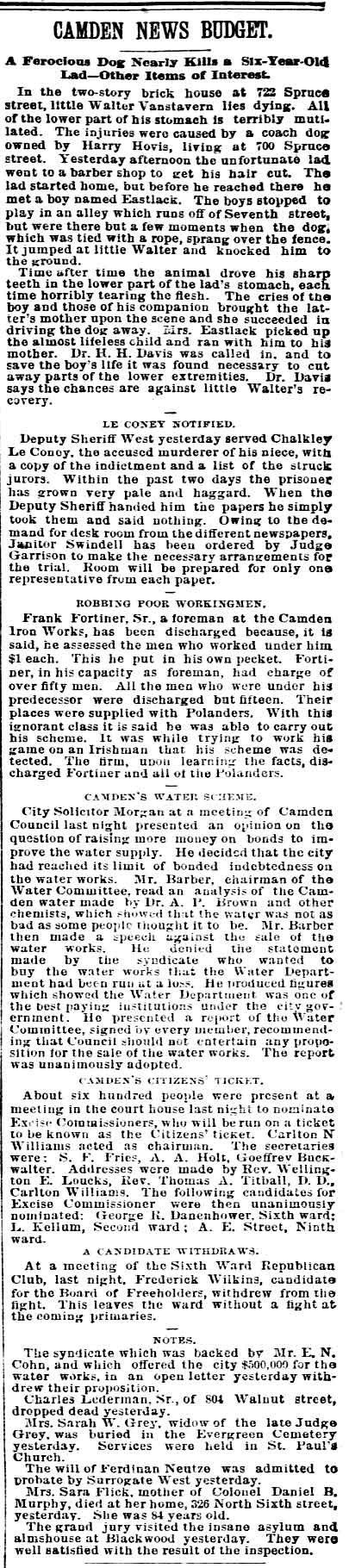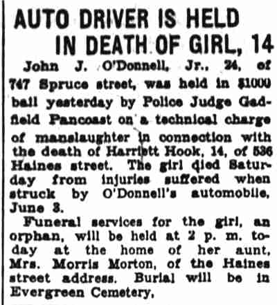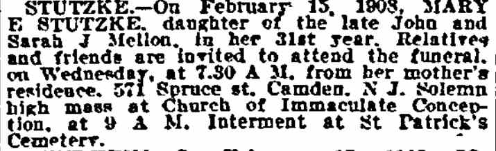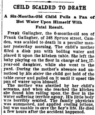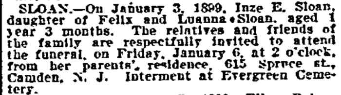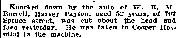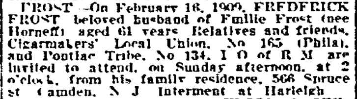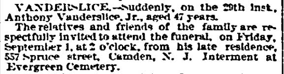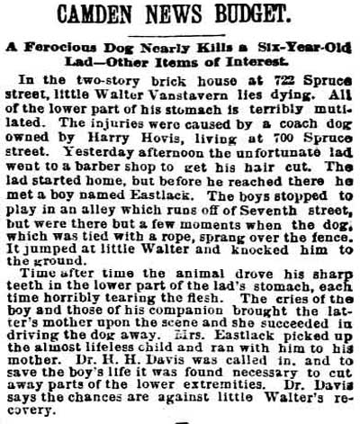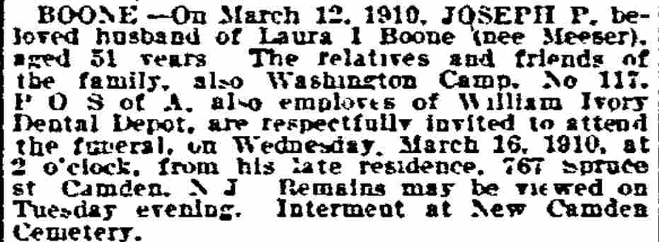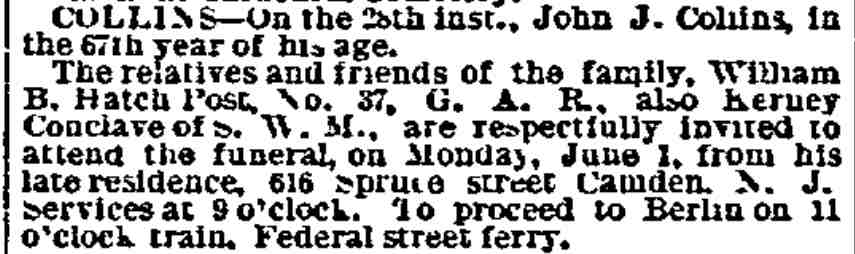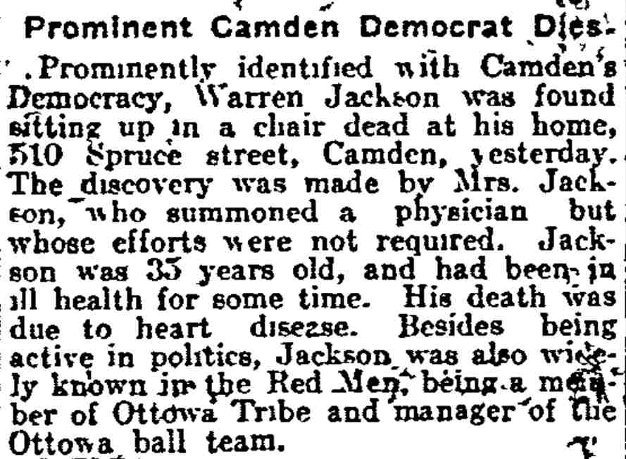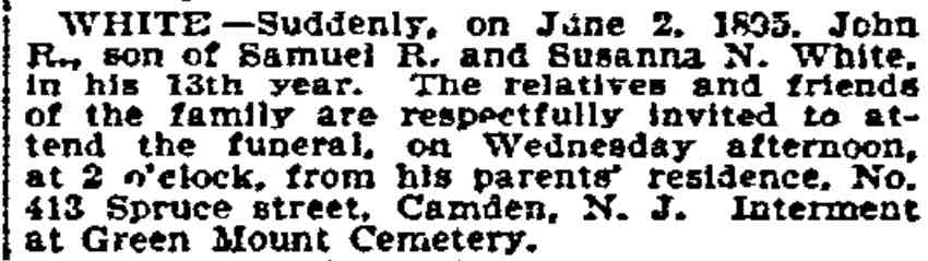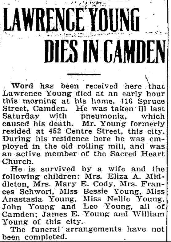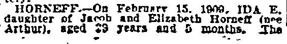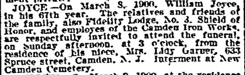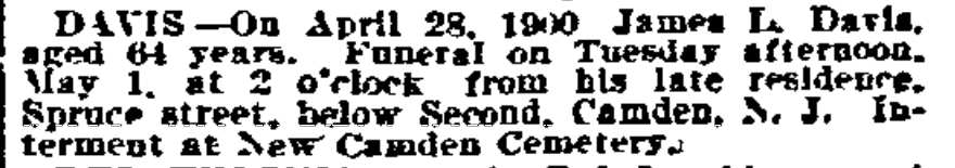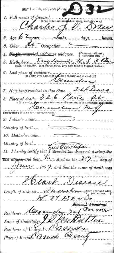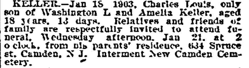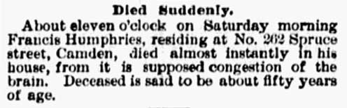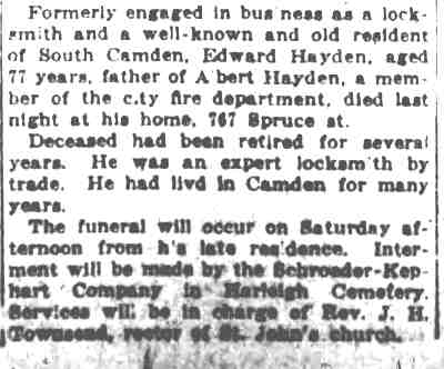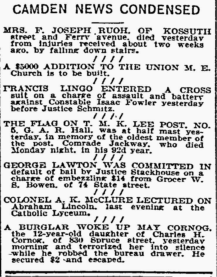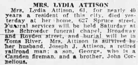 1917-1923 Mary Horseman, 75, formerly of Spring Street, died on July 16, 1917 of heart disease and was buried a New Camden Cemetery. |