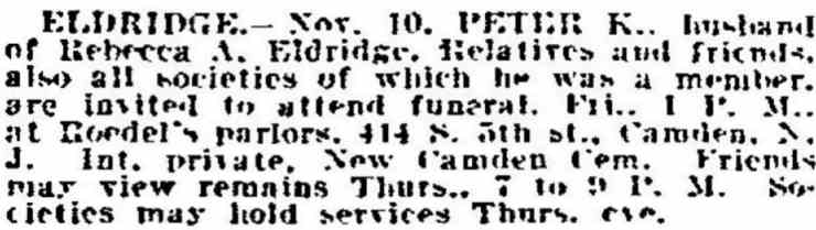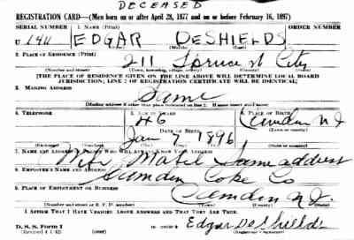 1942 Edgar DeShields, 46, died October 31, 1942 and was buried at Mt. Peace Cemetery in Lawnside, New Jersey |