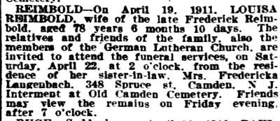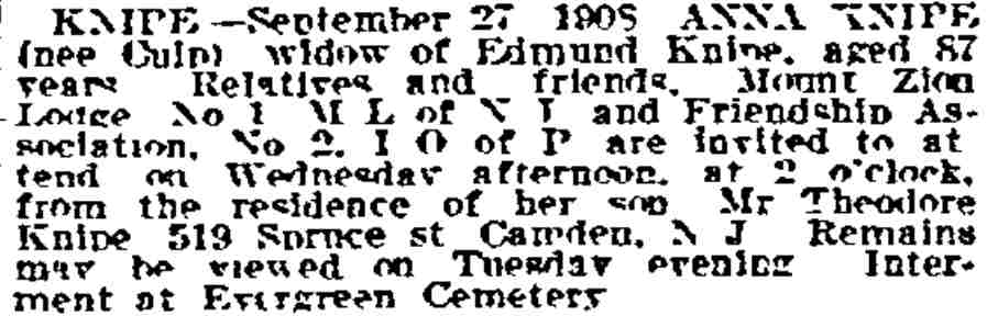 1937 Katie Blasberg died December 9, 1937 and was buried at Locustwood Cemetery, Delaware Township, N.J. |