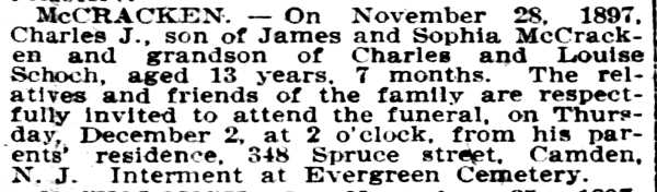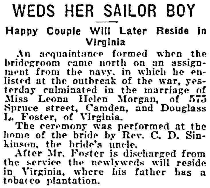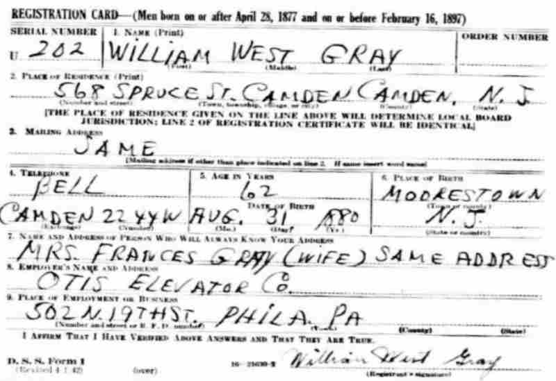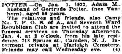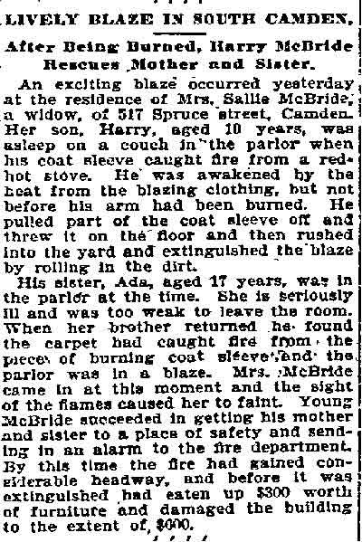 1920-1943 Harry Gowie, 84, died on April 27, 1937 and was buried at Evergreen Cemetery, leaving his widow, Virginia Gowie. It was a second marriage for him, his first wife, Mary N. having died in June of 1902. Virginia Gowie died on January 26, 1939 after breaking her thigh suffered when she slipped on pavement on December 31, 1938. She was buried at Arlington Cemetery in Pennsauken. Charles E. Vennell died on October 17, 1920. 1920-1940 Charles A. Richmond was Virgnia Gowie's son from her first marriage, to Benjamin Franklin Richmond. A former marine and Spanish American War veteran, he was employed as an asbestos worker. Charles Richmond died on May 25, 1927. 1941 Clarence F. Bringolf died on September 15, 1941 and was buried at Evergreen Cemetery. Frances Gowie was the daughter of Harry Gowie from his first wife, Mary N. Frances Gowie's daughter Adelaide was married to George Clay Wade of the Camden Fire Department. 1943 The Gowies are listed at this address in the 1943 Camden City Directory. THey are not listed in the 1947 edition. |