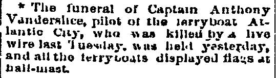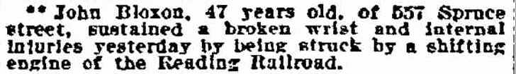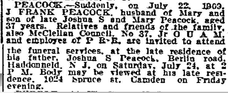 1908-1910 J. Frank Peacock was the engineer of a West Jersey Seashore freight train that collided head on with a fright train belonging to the Central Railroad at Bridgeton Junction, New Jersey on the morning of June 22, 1909. Click here for Bridgeton Evening News article from July 22, 1909. Philadelphia Inquirer |