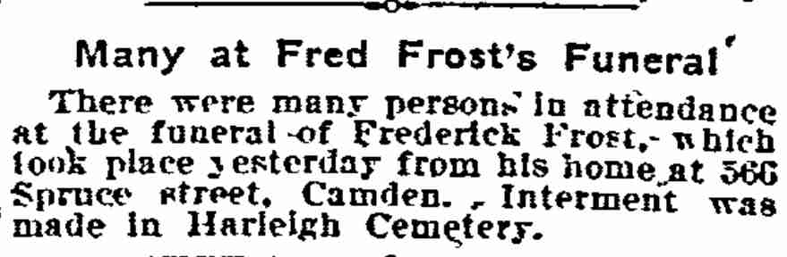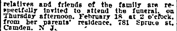 1919-1934 Mrs. Newton was the widow of J. Fred Newton, who had been Assistant Receiver of Taxes for the City of Camden in the 1900s. He passed away shortly before the compilation of the 1911 Camden City Directory. Harry Neff died November 13, 1934 and was buried at Harleigh Cemetery. Leona P. Newton died on December 30, 1934. |
