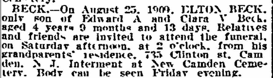 1905-1911 Mary E. Beckett died in March of 1911 at the age of 47. She was buried at New Camden Cemetery |