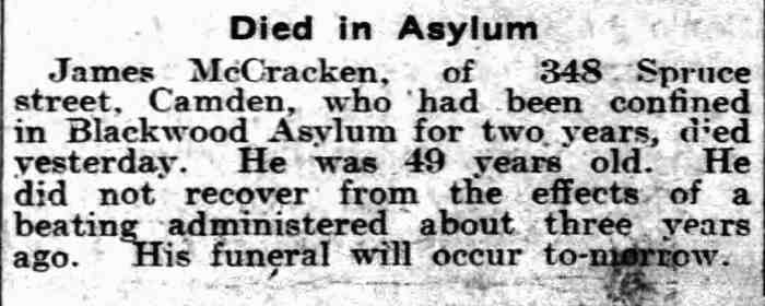 1913-1917 John McKeown, 54, died of carcinoma in October 18, 1917. He was buried at New Camden Cemetery on October 31, 1917. |