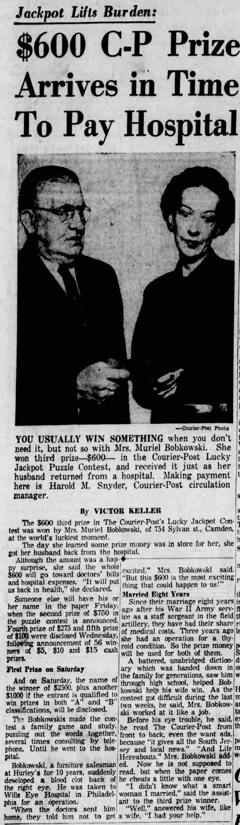 1955-1972 Camden Courier-Post YOU USUALLY win something when you don’t need it, but not so with Mrs. Muriel Bobkowski. She won third prize-$600- in the Courier-Post Lucky 31 Jackpot Puzzle Contest and received it just as her it husband returned from a hospital. Making payment here is Harold M. Snyder, Courier-Post. circulation manager.