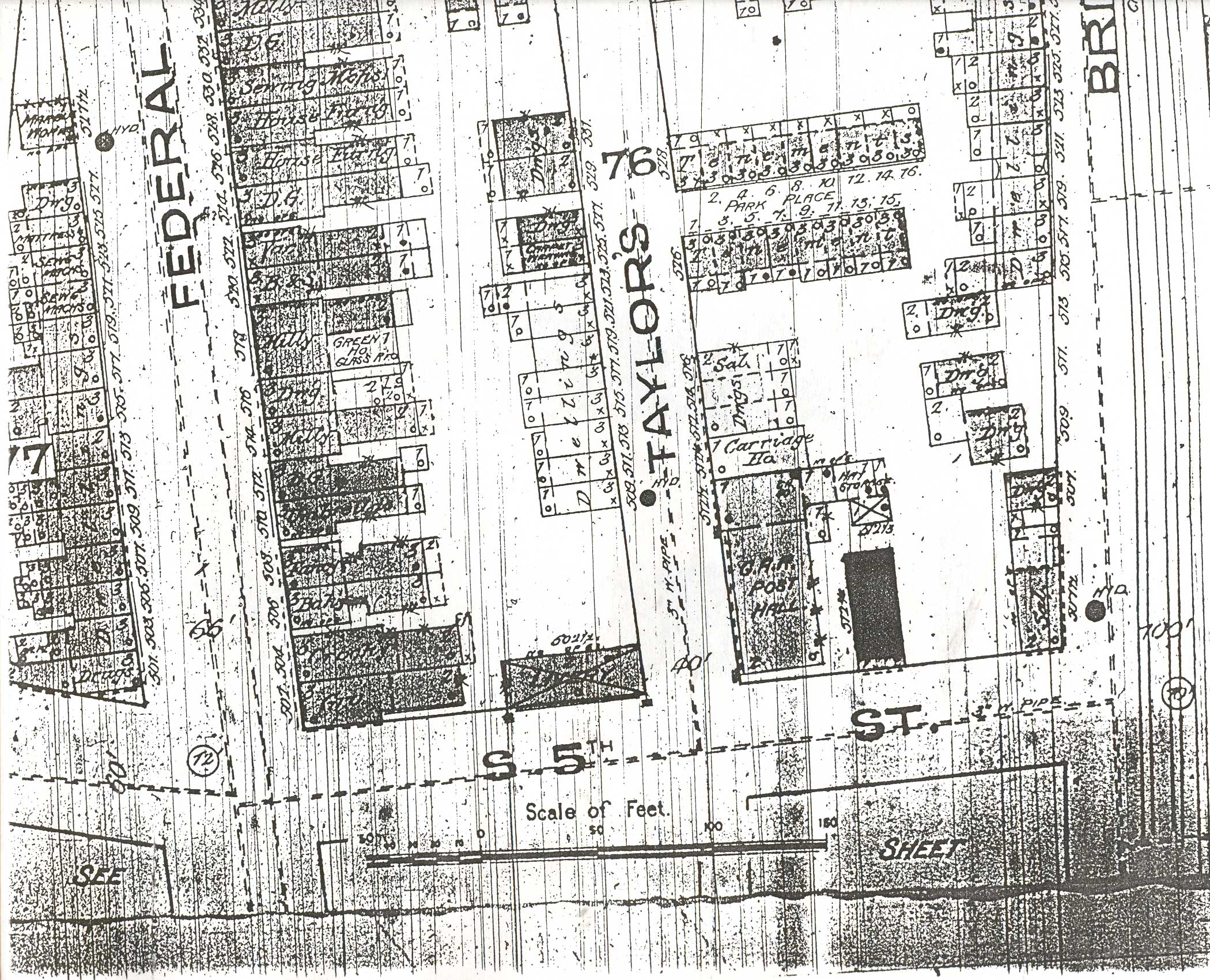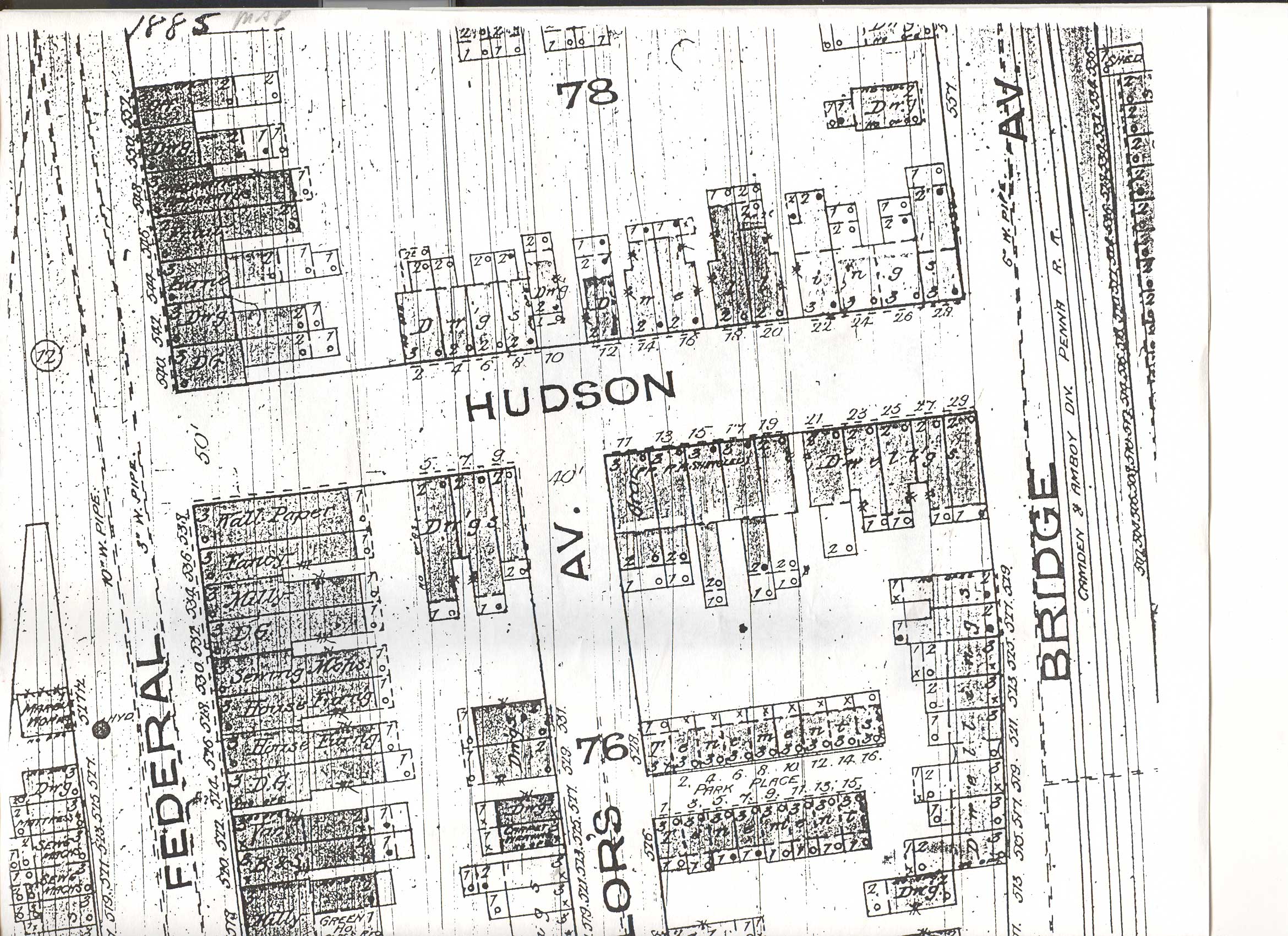 TAYLOR AVENUE , known in earlier times as Taylor's Avenue, was already laid out when Camden's first City Directory was published in 1850. It ran from South Front Street to 8 Hudson Street, just south of Federal Street. There were a few businesses, most notable perhaps the ketchup factory of F.P. Lawson in the 1880s and 1890s, and the Kerby families, bicycle factory, the federal Manufacturing Company in the last century. After World War I, Taylor Avenue acquired a "reputation", as many ladies of the night were active there, especially in the 300 block. This went on for quite some time. Around 1970 the City of Camden began acquiring much of the land on which Taylor Avenue lay, and the avenue has been for all intents and purposes off the map since the late 1970s. Most of the 300 block lies "underneath" the Camden County Jail and Hall of Justice. From South 4th Street to Hudson Street it is a parking lot. About the only evidence of Taylor Avenue in 2005 was the alley behind the Camden Free Public Library in the 300 block of Federal Street, which was originally the Public Service Gas & Electric Company building. |