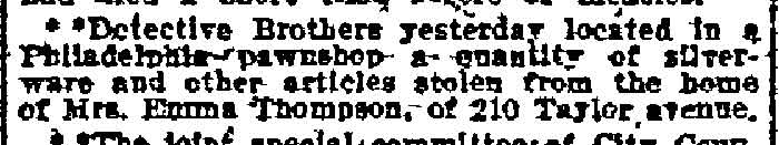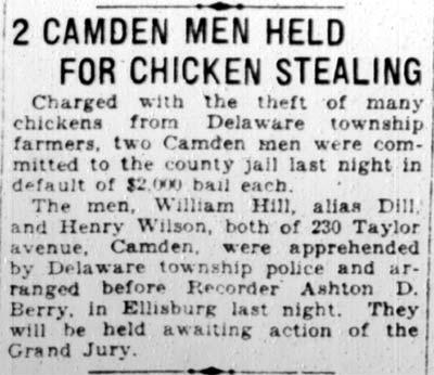 A passerby who thought he saw a house afire on Taylor Avenue near Third street, turned in an alarm that brought four fire companies on a monkey run yesterday. It required more than five minutes to find the house reported a fire when the apparatus pulled up at the alarm box at Third and Federal streets. Two policemen, Sergeant nathan petit and Marshall Thompson, who followed firemen to the scene were quicker than that for they found the house and a young woman hiding in the closet on the second floor. She was arrested along with a woman and a man. Taken to police headquarters the young woman, who identified herself as Margaret Pone, 17, of Park Avenue, Maple Shade, was held on a charge of vagrancy. Margaret Johns, and Louis Archer, 39, both Negroes, who were also found in the three-story dwelling at 230 Taylor Avenue, were also held as material witnesses. The reported fire turned out to be the smoking stove. |