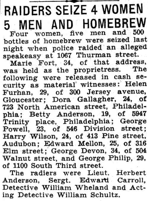 During the afternoon two raids were staged by Sergeant John Gilbert and Policemen Warner and Branch resulting in the arrest of two men and seizure of a still and a small quantity of alleged liquor. At the home of Stanley Saposki, 46, of 1066 Thurman Street, the raiders said they found a 25-gallon still, three gallons of “moonshine” and a complete set of coils. Saposki was arrested and later released under $500 bail. Only a half-gallon of alleged liquor was found in the home of Frank Beuclawski, 60, of 1422 Mount Ephraim Avenue, who likewise was arrested, then released under $5000 bail. |