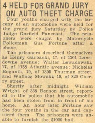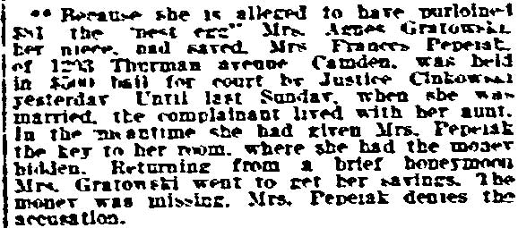 Tony Locantore, 20, of 314 Walnut Street, received a premature Christmas present from Judge shay when he pleaded guilty to a charge of assaulting Jennie Balassia, 16, of 576 Walnut Street. He was sent to jail and Judge shay instructed the sheriff to release him on December 24. Another Christmas present was handed out to Mrs. Mary Bieliniski, of 1041 Thurman Street, who was convicted of violating the child welfare act. The complaint was made by Mrs. Louise F. Walsh, secretary of the S. P. C. C., who charged that on September 19 the woman became intoxicated and brutally beat her seven children and put them into the streets. The children range in ages from two to 14 years. When Mrs. Walsh visited the house, she said, Mrs. Bieliniski threw a lamp at her. She also will be released from the county jail on December 24. |