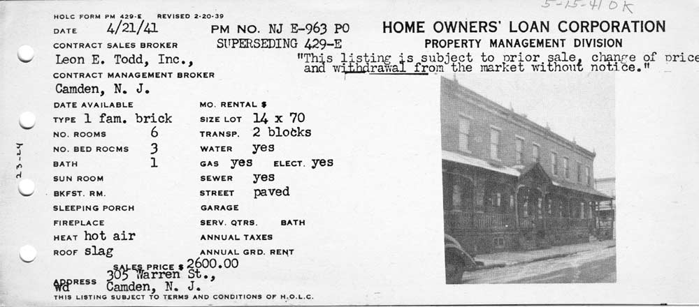 WARREN AVENUE ran for one block, southeast from Mickle Street to what was 781 Wright Avenue, parallel to Haddon Avenue and Carteret Street. Warren Avenue first appeared in Camden's City Directories in 1899. There were homes occupied on Warren Avenue into the 1960s, however by 1969 Warren Avenue had no listings in the New Jersey Bell Telephone Reverse Directory, and was most likely gone. Like Carteret Street, which followed Warren Avenue into oblivion shortly afterwards, it was erased to make way for Route 676 and the Three Cooper Plaza medical building. Warren Avenue's exact location is roughly underneath the access ramp to Route 676 from what is now Mickle Boulevard. |