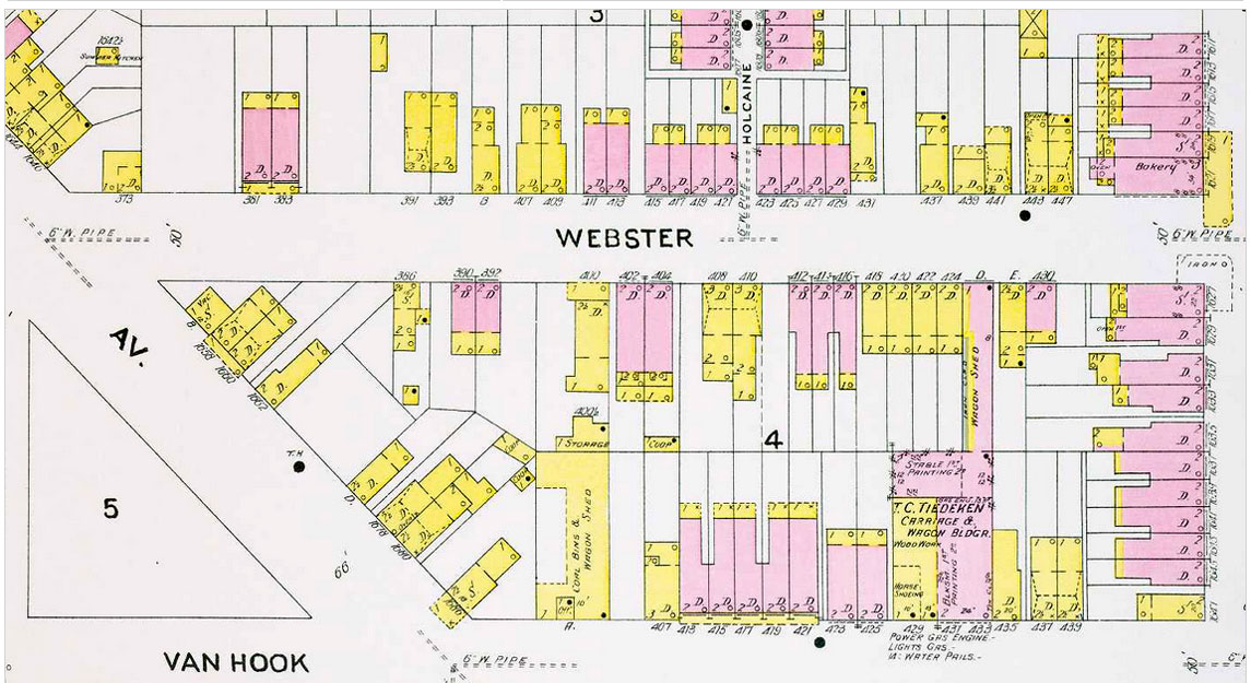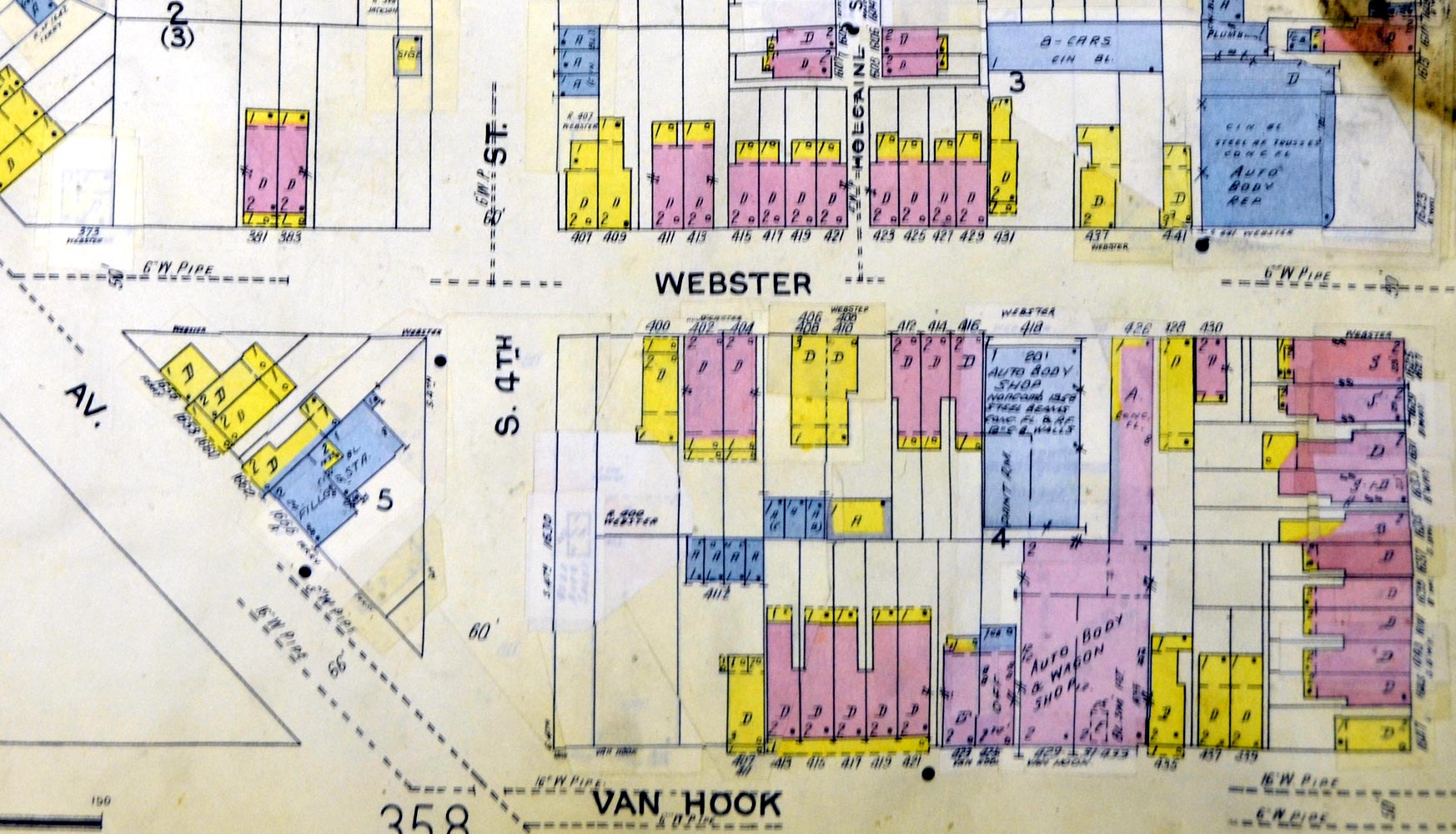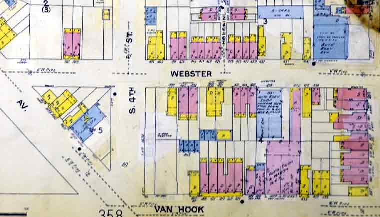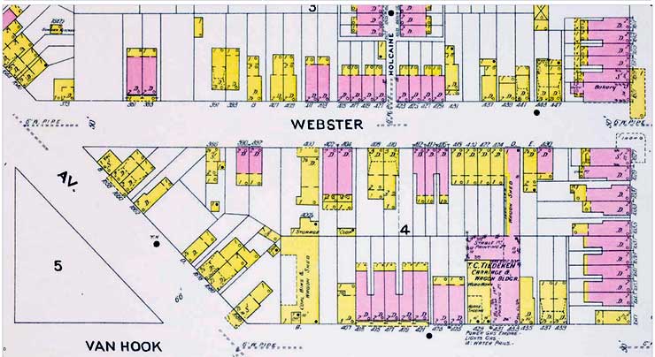 WEBSTER STREET is a small street that runs from east from Ferry Avenue for two blocks until it reaches its end at Broadway. The street was laid out prior to 1878 and there were people living on Webster Street in the 1870s. At some point after 1906 houses on Ferry Avenue and Van Hook Street were razed and South Fourth Street was extended out from Everett Street South, through Webster to Ferry Avenue. |